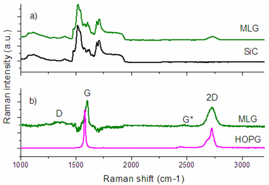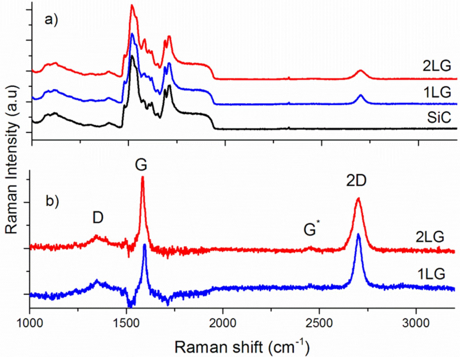 However, during the high-temperature annealing process, the SiC substrate forms terraces with a typical height of 2–20 nm and eventually develops a complex surface morphology, which strongly depends on the growth conditions (temperature, gas atmosphere, pressure) as well as the initial miscut angle of the substrate. Most importantly, thermal decomposition of SiC is not a self-saturated process, which may result in the coexistence of graphene layers of various thicknesses. Thus, the SiC substrate significantly hinders straightforward identification and determination of the graphene layer thickness. For electronic applications in particular, it is crucial to define the number of graphene layers precisely as, for example, one and two layers of graphene (LG) are characterized by a completely different band structure and possibility to open the energy gap, defining the properties of devices. When morphology studies are performed in ambient conditions, the presence of water and various adsorbed species on the surface of graphene may further complicate the layer identification [7,8,9].