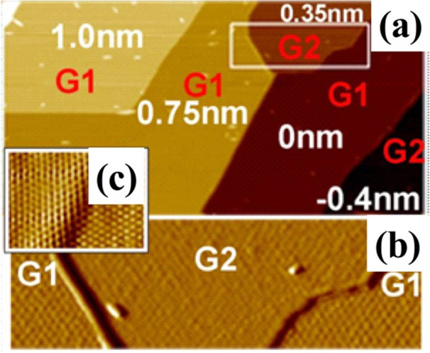 (a) 250 × 250 nm2 area scanning tunneling microscopy (STM) image showing different heights on a graphitized 6H-SiC(0001) sample; (b) The outlined white box of Figure 1a. All step heights can be written in terms of s = 0.25 nm or g = 0.35 nm; (c) Single layer graphene growing uninterrupted over a graphene step.