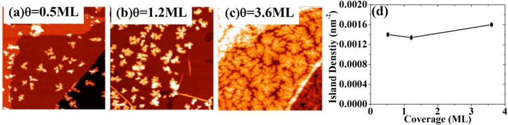 STM image of Gd on graphene (a) 210 × 210 nm2, θ = 0.5 ML; (b) 250 × 250 nm2, θ = 1.2 ML; (c) 250 × 250 nm2, θ = 3.6 ML; (d) Constant island density vs. coverage at room temperature (RT) for Gd on graphene with F = 0.12 ML/min.