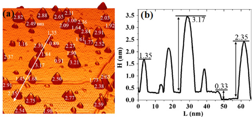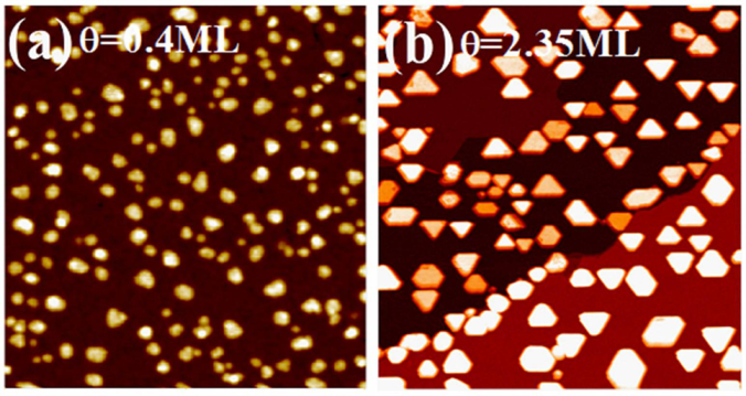 (a) The nucleated island density after 0.4 ML of Dy has been deposited at room temperature over an area of 1000 × 1000 Å2. The island density is 2 × 10−4 islands/Å2 indicating slow diffusion; (b) Dy (2.35 ML) deposited on graphene with a flux rate 0.23 ML/min at 660 K. The area size is 2500 × 2500 Å2. These islands have height difference multiples of 0.28 nm, the Dy step height.