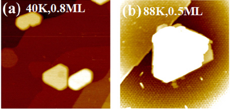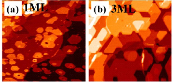 (a) 250 × 250 nm2 STM images for θ = 1 ML of Eu deposited on graphene at RT with a deposition rate 0.2 ML/min. The islands are large and crystalline of main height 0.75 nm with well-defined facets; (b) The film closes in a layer-by-layer fashion if the deposition of Eu continues to 3 ML as shown in the STM image of 250 × 250 nm2.