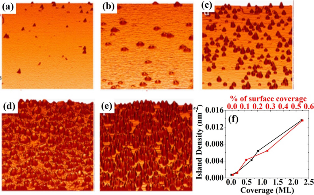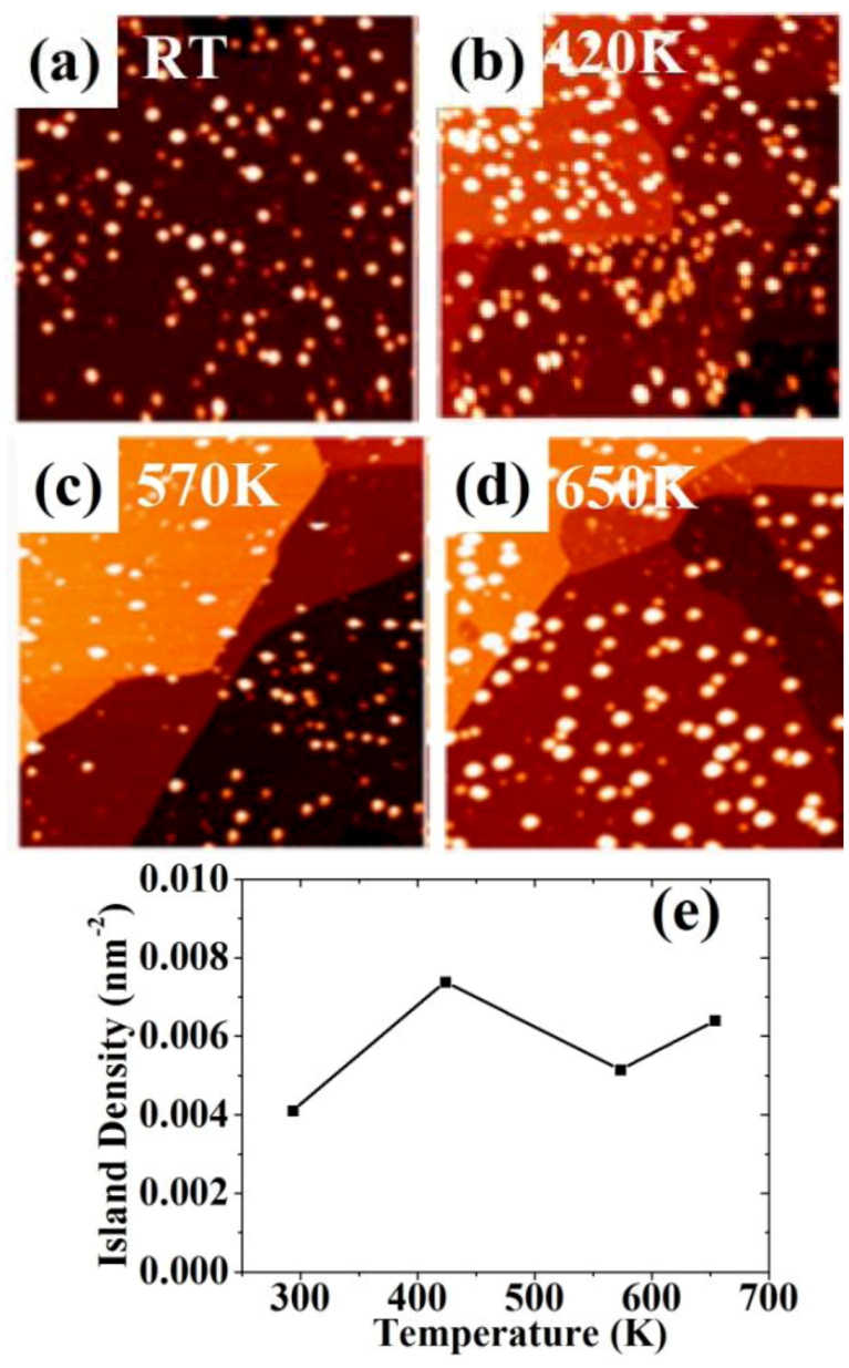 The temperatures and converges are (a) RT, 0.65 ML; (b) 420K, 0.65 ML; (c) 570K, 0.54 ML; (d) 650K, 1.05ML; (e) Temperature dependence of the island density n from 300 to 650 K. Classical nucleation predicts an Arrhenius dependence of n with temperature while images (a–d) instead show an almost constant island density. Each image is 200 × 200 nm2.