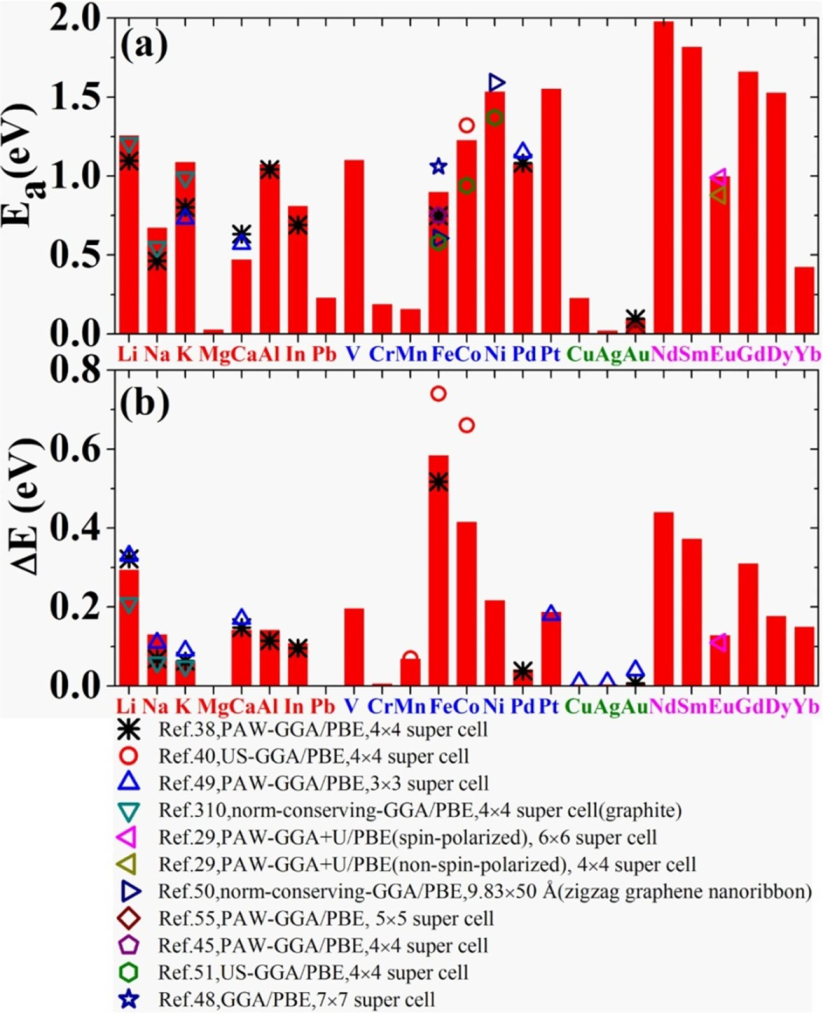 (a) Adsorption energy (Ea); (b) Diffusion barrier (ΔE). The bars correspond to the work by the current calculations and the symbols to results in the literature.