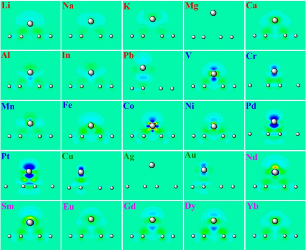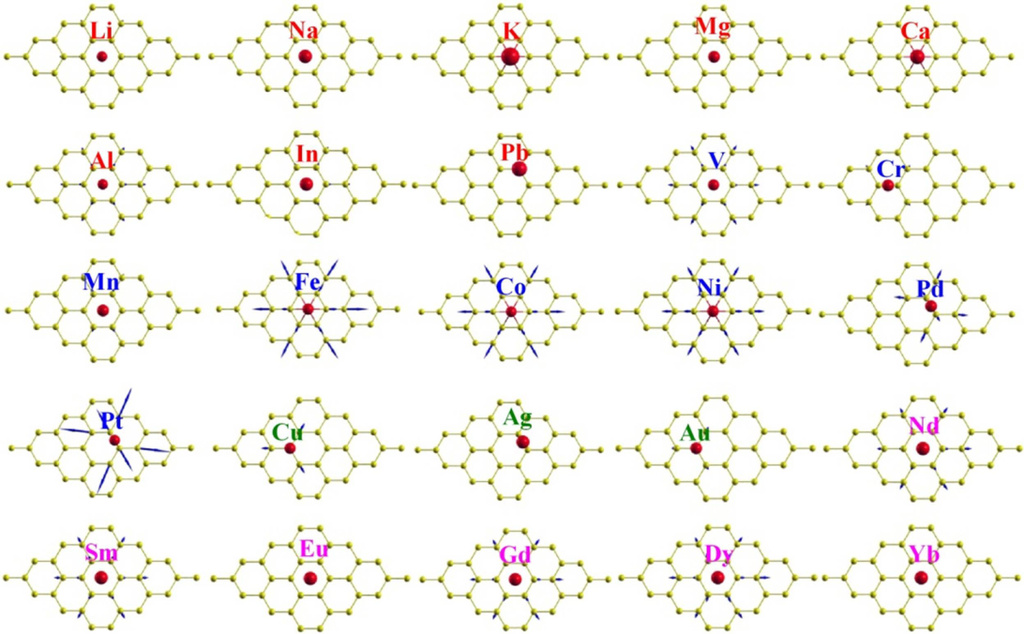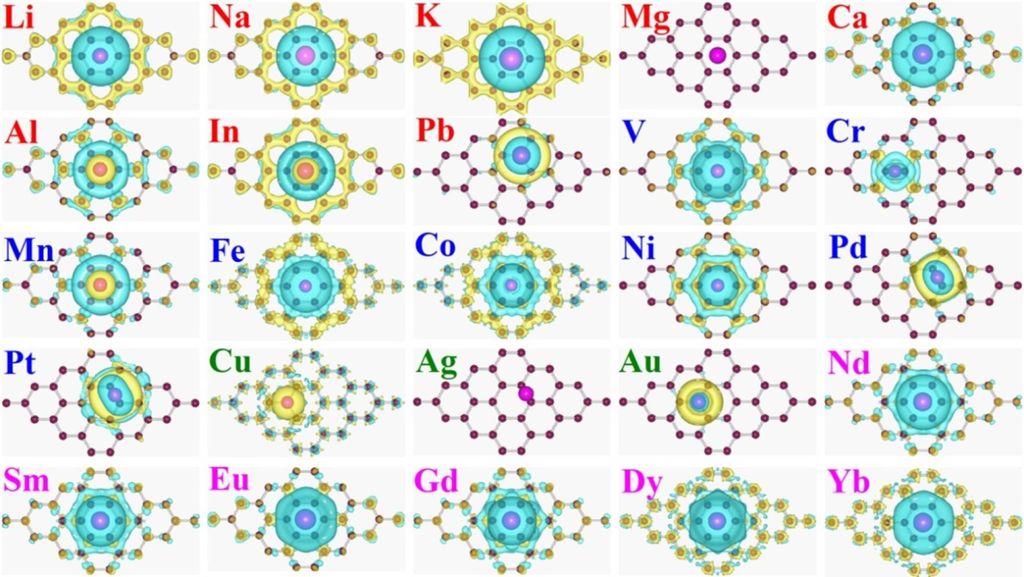 The gold color (i.e., 0.004 e/Å3) in the 3D plot indicated an increase in the electron density upon adsorption, and the cyan color (i.e., −0.004 e/Å3) indicated an electron density loss. A two-dimensional (2D) contour plot of the BED in the vertical planes cutting through the adatom and the carbon atoms of the graphene layer is also shown in Figure 10. The region with a higher bonding charge between adatoms and carbon atoms in Figure 9 and Figure 10 indicates stronger covalent bond formation by adatom adsorptions. As shown in Figure 9, the bonding charge distribution induced by simple metal adsorption is delocalized, especially for alkali metal adatoms. The electrons transferred from alkali metal adatoms spread over the whole graphene layer. In comparison, the induced bonding electron density by 3d-transiton, group 10 transition metals, and noble metals on graphene is mainly localized on the carbon atoms next to the metal adatoms. For the rare earth metal adatoms, the bonding charge distribution (expect for Yb) is intermediate between the alkali and 3d-transition metal, i.e., the Δρ(r) exhibits some degree of localization but is not as strong as those of transition metals on graphene. For Yb on graphene, the bonding charge distribution is delocalized due to charge transfer since the interaction between the Yb adatom and graphene is ionic. The bonding charge distribution is similar to the case of alkali metals on graphene and spreads over the whole graphene layer.
