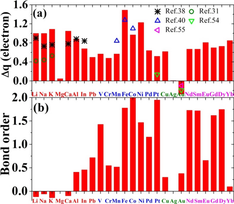 (a) Charge transfer (Δq) due to adatom adsorption; (b) Bond order of adatom/graphene system.