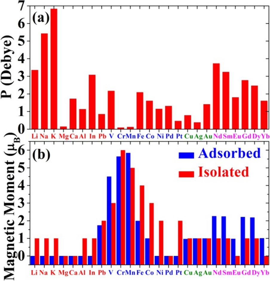 (a) Electric dipole moments; (b) Magnetic moment for metal/graphene system (blue bar) and isolated metal atoms (red bar).