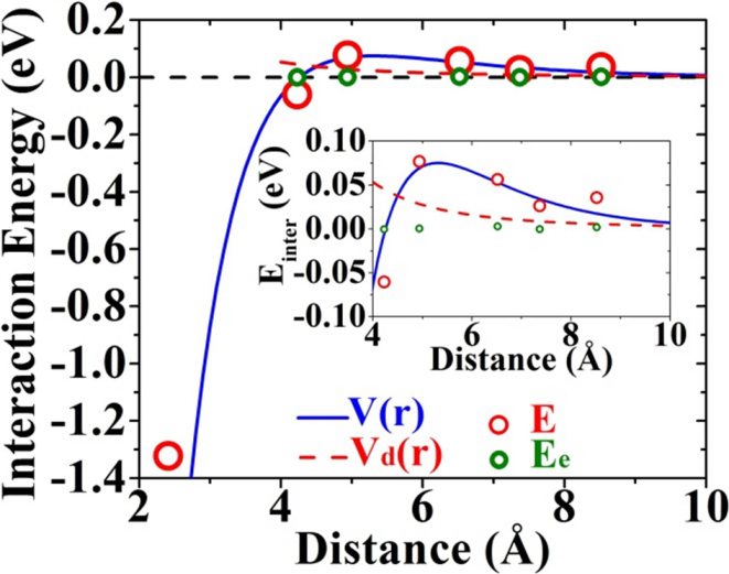 Interaction energy E (red large open circle symbols) and V(r) (blue solid line) of Fe–Fe adatoms on graphene as a function of Fe–Fe separation. Ee (small open symbols) and Vd(r) (dash line) are elastic interaction and dipole-dipole interaction, respectively.
