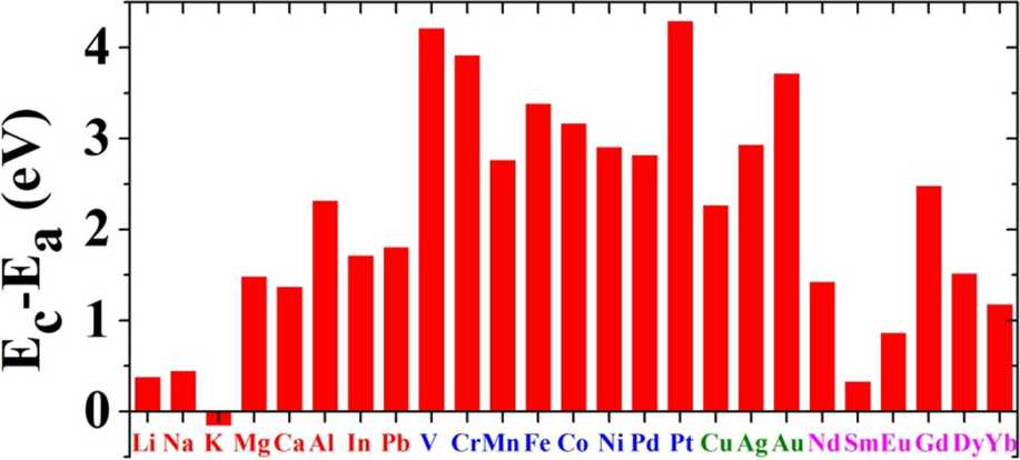 The Ea/Ec is plotted in Figure 14 as a function of the different adatoms. The diffusion barriers ΔE have been given in Figure 8b. Liu et al. [71,72,73,74,75,76,77,78] found that almost metals (except alkali metals, Nd and Sm) have an Ea/Ec ratio smaller than 0.5. In particular, the Ea/Ec ratios for Cr, Mn, Cu, and Au on graphene are extremely small. These results suggest that most of the 3d and group 10 transition metals, noble metals, and rare earth metals on graphene will favor a 3D growth mode. In addition, Cr, Mn, Pd, Cu, Ag, and Au adatoms on graphene exhibit very small diffusion barriers. Therefore, kinetically limited growth would result in relatively large island sizes and small island densities even below room temperature. On the other hand, a high island density and a smaller island size should be expected for other metals on graphene, especially for Fe, Co, Ni, Pt, and Gd. The results of Ea/Ec ratios and diffusion barriers from the calculations can explain some of the features in the growth morphologies observed in the STM experiments as discussed above. The small Ea/Ec ratios for Fe on graphene suggest that these metals will grow in 3D mode on graphene, consistent with experimental observation (i.e., Figure 5, Figure 6). The Pb adatom has extremely low diffusion barrier so that the adatom can move very fast to form the big crystalline islands even at very low temperature (i.e., Figure 7). By contrast, the diffusion barrier of the Fe adatom is much higher so the island density is much higher. By comparing both rare earth metals Gd and Eu on graphene, they [72,76] find that Gd exhibits relatively higher diffusion barrier and smaller Ea/Ec ratio (0.36) as compared to those of Eu which has a diffusion barrier of 0.14 eV and a Ea/Ec ratio of 0.50. The calculation results can also explain why the high density of fractal islands of Gd on graphene. For Eu the diffusion barrier is lower and the Ea/Ec ratio is high which explain why the crystalline islands grow quickly in almost layer-by-layer fashion (i.e., Figure 4). Only at high temperature (660 K), the growth of Dy can overcome the barrier and grow in bigger crystalline island as shown in Figure 3. However, Gd transforms into hexagonally shaped crystalline islands only when it is heated to a higher temperature 600 °C (i.e., Figure 2). The growth morphology difference is consistent with the calculated diffusion barriers.