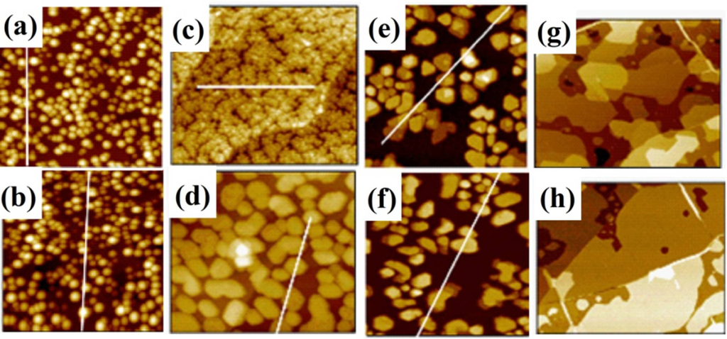 For Gd growth on graphene, fractal-like morphology [72,74,78] is observed with RT deposition even at a high coverage of 4.0 ML, as shown in Figure 18c. The fractal-like morphology is stable up to 800 K but a transition to crystalline shapes occurs at higher annealing temperature. This is shown in Figure 18d where the film at Figure 18c was annealed at 1050 K for a short time (5 min). The island height histograms indicate that the islands also grow in height after annealing but the island density is similar (within 10%) before and after annealing. The larger relative increase in height vs. size upon annealing can be seen from the 1D line scan as shown in Figure 19b.