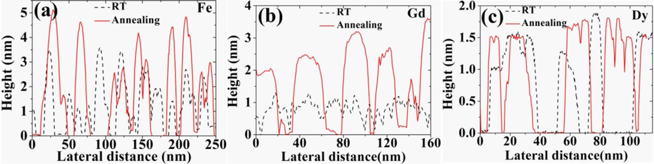 As reported by Liu et al. and Hupalo et al. [72,74], the growth of Dy on graphene is somewhat different from Fe and Gd on graphene. 2.0 ML of Dy deposited on graphene at RT with F = 0.22 ML/min results in island density N = 6 × 10−3 islands/nm2 as shown in Figure 8e. Annealing to 580K transforms the multiple level islands (4–7 Dy layers) into more uniform height (6 and 7 layers) islands and some of the islands are found to coalesce (Figure 18f, Figure 19c). These results indicate lower thermal stability of Dy nanoparticles on graphene, as compared with Fe and Gd. The 1D line scan in Figure 19 not only show the larger relative increase in height vs. size (higher aspect ratios) upon annealing, but also show that the islands form more uniform height islands after annealing. Dy is the metal with the least amount of changes as seen in Figure 19c and the islands always have nonuniform tops before and after annealing, indicating unusual nucleation sites when the Dy islands nucleate initially.