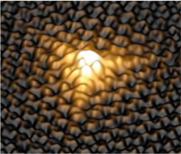 The simplest defect in any material is the missing lattice atom. Single vacancies in graphene have been experimentally observed by transmission electron microscopy (TEM) [,] and scanning tunnelling microscopy (STM) []. Figure 1, for example, shows the local electronic fingerprint of a monovacancy revealed by an STM image, produced on graphite through Ar+ ion-irradiation []. Vacancies can also be used as a simplified model for other types of defects that modify the hybridization of the atomic orbitals, such as adsorbates covalently bound to the carbon atoms. This type of disorder has several effects on the electronic structure of graphene, as the introduction of zero energy modes when the vacancies are unequally distributed among the two sublattices []. As for transport properties, localization effects have been predicted to be suppressed for disorder that preserves the graphene sublattice symmetry []. Vacancies, when equally distributed among the two sublattices, preserve such a symmetry of the system and lead to the saturation of the conductivity at σ0 = 4e2/(πh) when increasing the vacancy density [,]. This behaviour suggests the suppression of localization phenomena. However, these theoretical predictions were obtained in the semi-classical limit, while other recent studies on hydrogenated graphene [,] have shown that the finite value of the conductivity is not robust in the quantum regime.