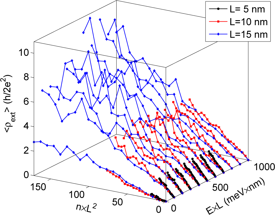 To verify this scaling, in Figure 10, ρext is plotted as a function of n × L2 for some selected values of E × L. Note that, due to rescaling, the available data cover smaller regions for larger L. Figure 10 summarizes some of our main results: (i) the reduced extrinsic resistivity at the Dirac point with respect to the other energy regions; (ii) the approximately linear dependence of the extrinsic resistivity on the defect density n; (iii) universal scaling of the average extrinsic resistivity as a function of E×L and n×L at the Dirac point. At higher energies, the superposition of the curves progressively degrades, especially at higher densities for which the rise of the extrinsic resistivity turns out to be faster for short L. This is physically sound, because for short pristine undoped regions, the transport coefficients of individual conductive channels through the evanescent states are higher than for undoped longer regions. Therefore, apart for energies around E = 0 where resonant impurities play a major role, they are proportionally more strongly affected by disorder.