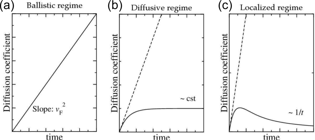 Ballistic regime. Electrons travel through the systems without suffering any scattering, so that DE(t) and XE(t) are linear functions of time, with slopes respectively equal to and vF.