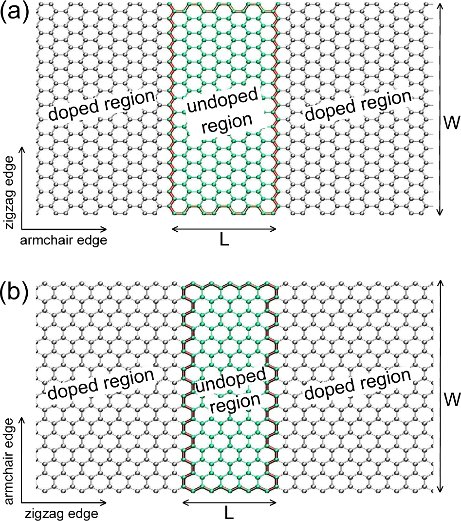 In the tunnel junction configuration, the system consists of a large armchair graphene nanoribbon (aGNR) or zigzag graphene nanoribbon (zGNR) with width W, see Figure 3, with highly doped contacts and an undoped section of length L. The doping is obtained by setting a superimposed potential V on the doped regions. In our simulations, we choose V = −1.5 eV, this entailing a n-type doping.