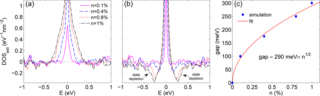 The extrinsic DOS in the uncompensated (AA) case are plotted in Figure 4b, for the same vacancy densities. As expected, the breaking of A-B symmetry generates a relatively sharp peak at zero energy. The peak height increases with vacancy concentration and this occurs at the expense of the DOS at the sides of the Dirac point, where the extrinsic DOS becomes negative. Although we cannot yet be conclusive about this point, it could be the effect of a gap opening, partially hidden by the wings of the convoluted zero-energy peak. This could explain contradictory observations as reported in [,]. Reference [] pinpoints the opening of an energy gap, whereas [] suggests the absence of localization in the uncompensated case for energies close to Fermi level. Figure 4c shows our estimation of the simulated gap against n and its fit, which gives