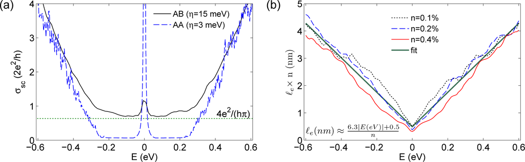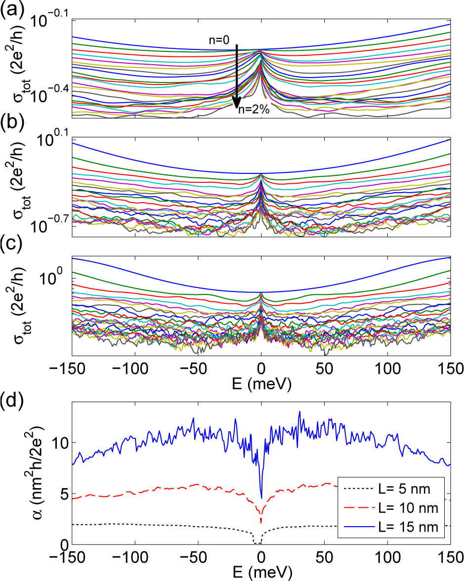From the analysis of the data, it turns out that, away from the Dirac point, the average extrinsic resistivity is roughly proportional to n, i.e., < ρext(E, L, W, n) ≥ α(E, L, W) × n, at least at the low densities here considered and as long as the resistivity is not too high. The estimated α is shown in Figure 9d. Around E = 0, α decreases and indeed the linear behaviour of the extrinsic resistivity is limited to low densities, while it becomes sublinear at higher densities, thus indicating the slower decay of the minimum conductivity at the Dirac point.