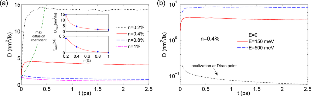Figure 6b focuses on the case n = 0.4%. At energies far from the Dirac point, the decay of the diffusion coefficient is very slow, indicating that the system is in the diffusive transport regime. Close to the Dirac point, on the contrary, the behaviour is very different. First of all, the maximum diffusion coefficient is much smaller than away from E = 0. This might appear to be in contrast with the zero-energy peak of the semi-classical conductivity observed in Figure 5a. However, we have to consider that this peak is the combined result of an extremely high DOS and a relatively low Dmax. The second difference is that the diffusion coefficient at the Dirac point decreases considerably with time. Such a result clearly indicates that the transport regime at the Dirac point undergoes a transition from diffusive to strongly localized.