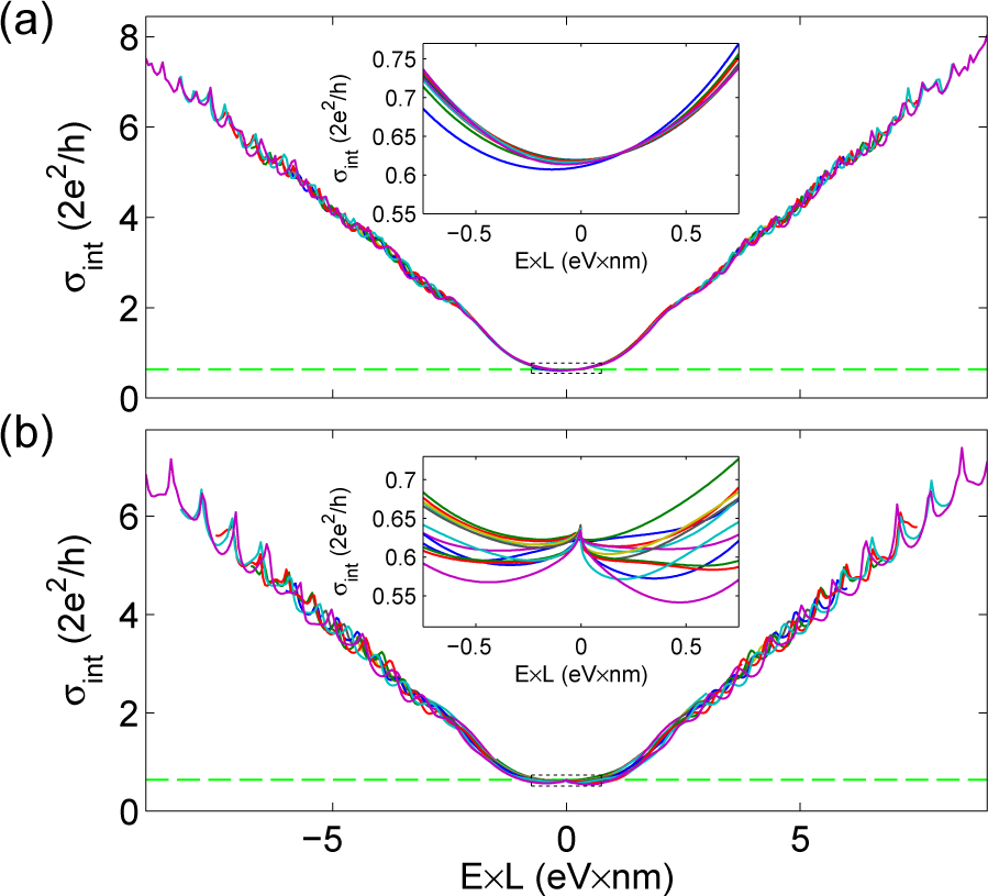 Let us start this section by briefly illustrating the results for the intrinsic transport properties of the system, i.e., in the absence of vacancies. As seen in Figure 3, the undoped region between the two highly-doped contacts is a ribbon section with edges W and L. For given width W (< L) of the system, the number of active conductive channels M(E, L) in the undoped section is thus determined by the energy E and the length L. If the system has armchair edges, the nanoribbon section has two armchair edges with length L and two zigzag edges with length W, see Figure 3a. Therefore, the number of conductive modes varies as the number of modes in a zigzag nanoribbon with width L. At low energies, M(E, L) = Mzigzag(E × L) depends only on the product E × L. If the system has zigzag edges, the nanoribbon section has two armchair edges with length W and two zigzag edges with length L, see Figure 3a. Similarly to the prior case, the number of conductive modes varies as the number of modes in an armchair nanoribbon with width L. At low energies, M(E, L) = Marmchair(E × L) changes for different armchair ribbon families, represented by ribbons consisting of 3n, 3n+1 or 3n+2 dimer lines, with n an integer number. Therefore, L determines the energy scale of the region around the minimum conductivity, where we expect that, for W > L and E close to 0, σint(E, L, W ) and ρint(E, L, W) are universal functions of E × L. At higher energy, a larger frequency component scaling with E × W develops due to the progressive opening of the sub-bands corresponding to transverse confinement []. This behaviour is confirmed by Figure 7, where all curves are seen to collapse onto a universal curve under appropriate rescaling.