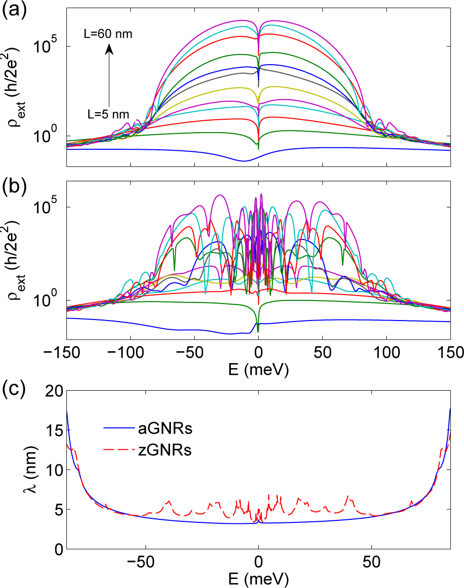 In the gap region, the extrinsic resistivity increases exponentially, i.e., ρext ∝ exp (L/λ). Figure 8c shows the estimated values of λ for the aGNRs and the zGNRs as a function of the energy in the region of the gap. For both aGNRs and zGNRs, we have λ ≈ 5 nm. It is important to notice that the gap width is independent of the ribbon chirality, and it is of the same order of that found for 2D graphene, see Figure 4c. The scaling of the gap with n1/2, not shown here, is also verified for ribbons [].