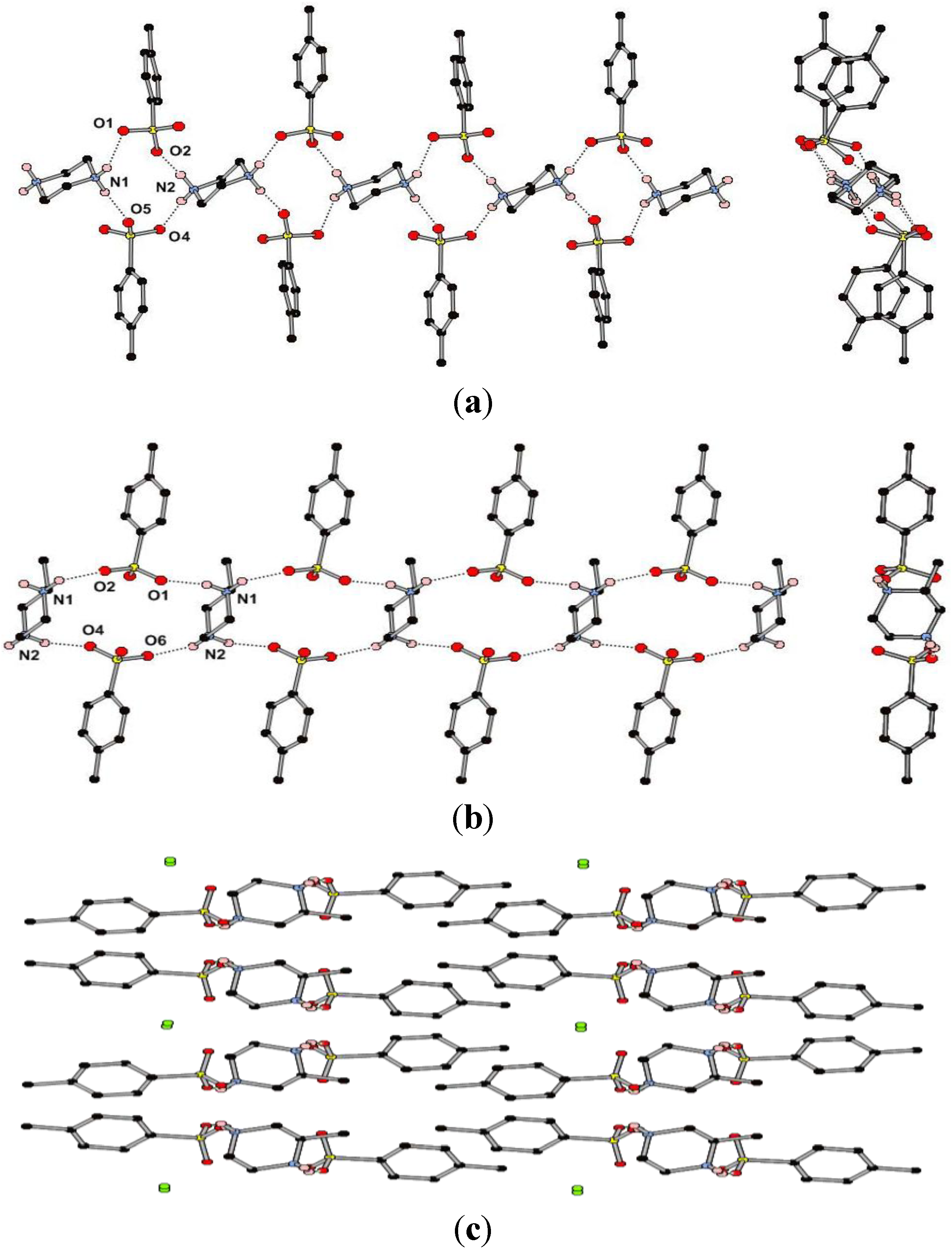 (a) Views perpendicular to and along part of the 1D hydrogen bonding chain in the structure of (pipH2)(TsO)2 (1); (b) Views perpendicular to and along part of the 1D hydrogen bonding chain in the structure of (MepipH2)(TsO)2·½H2O (2); (c) Packing diagram of (MepipH2)(TsO)2·½H2O showing the accentricity and the location of the water molecules (in green).
