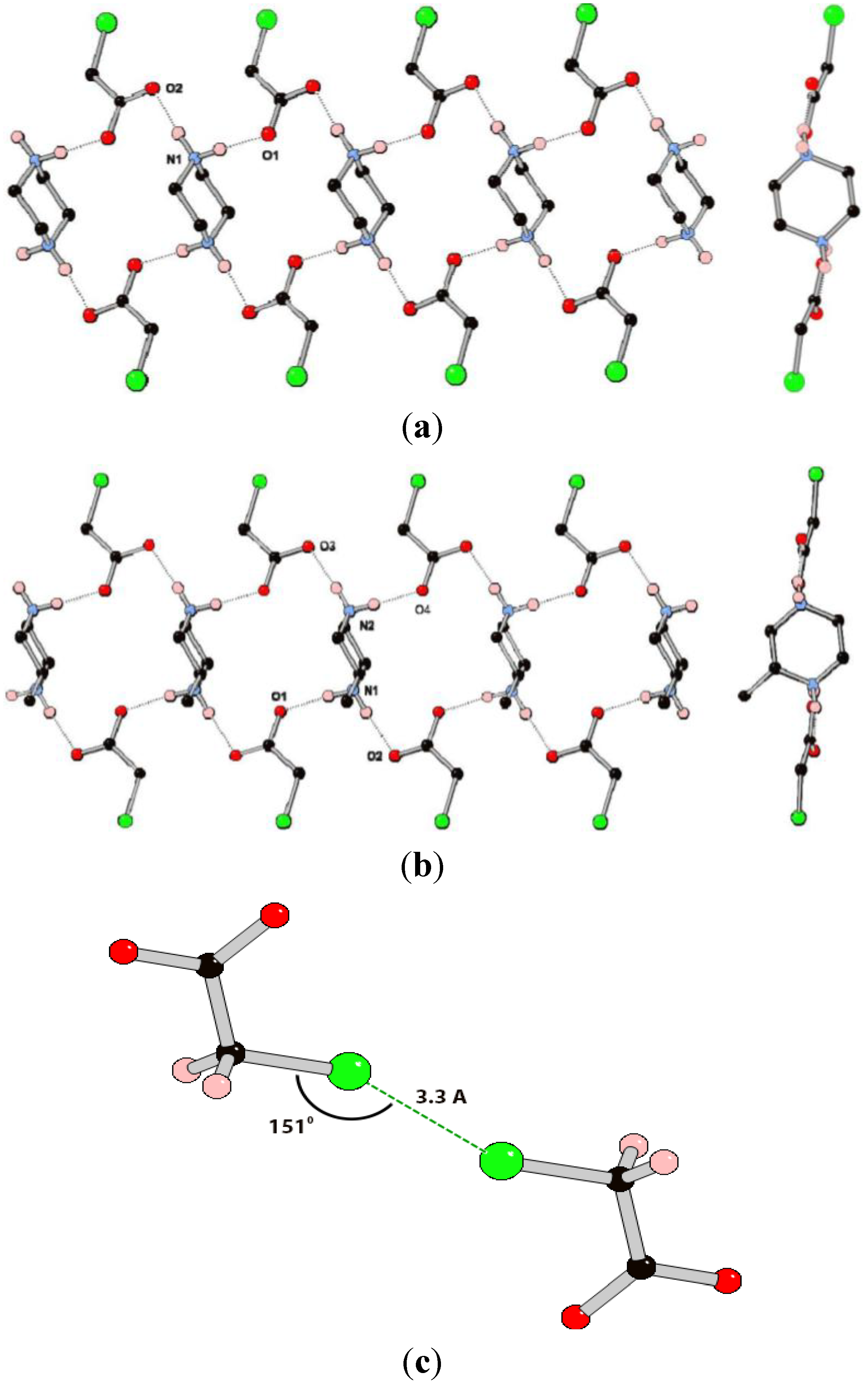 Compound 3 crystallizes in the space group P-1 with one chloroacetate anion and half of a piperazinediium cation in the asymmetric unit. The ions arrange to form a 1D hydrogen-bonded chain containing the Rring (Figure 4a). There are only two crystallographically unique hydrogen bonds in the structure which have similar geometric parameters (Table 2). In contrast to the structures of 1 and 2, there are no additional hydrogen bonds between the chains in 3, presumably due to there being less acceptor sites in the anion. The only tentative interaction appears to be a close contact between the chlorine atoms of nearby anions with a Cl···Cl distance of ca. 3.3 Å which is within the sum of the van der Vaals radii, and a C–Cl···Cl angle of 151° [29,30,31]. These geometric parameters are in excellent agreement with those set out by Awwadi et al. [32,33] based on database and computational studies, for halogen bonding between sp3 hybridized carbon-halogen groups and are classified as “type I” halogen···halogen interactions.
