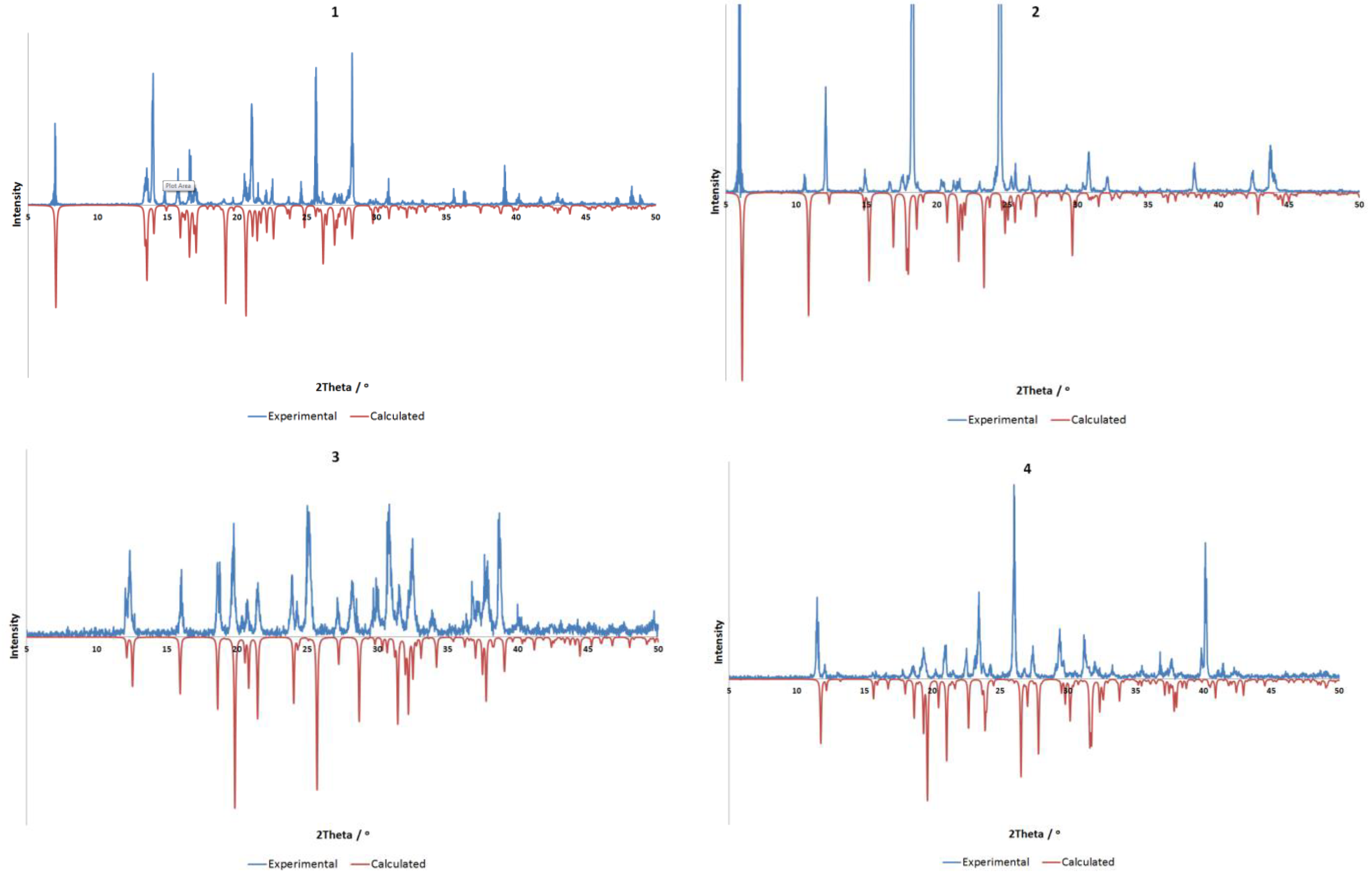 Comparison of experimental (298 K) and calculated (100 K) powder X-ray diffraction data for compounds 1–4. All compounds show good agreement, allowing for minor differences resulting from temperature, with preferred orientation of the experimental sample evident in all cases.