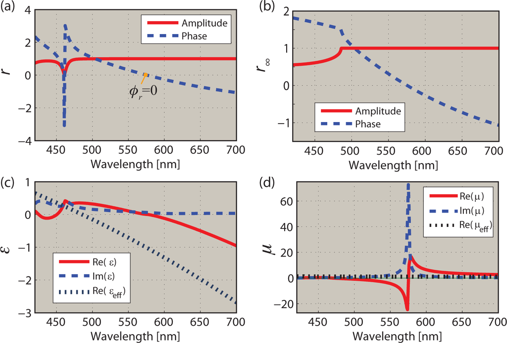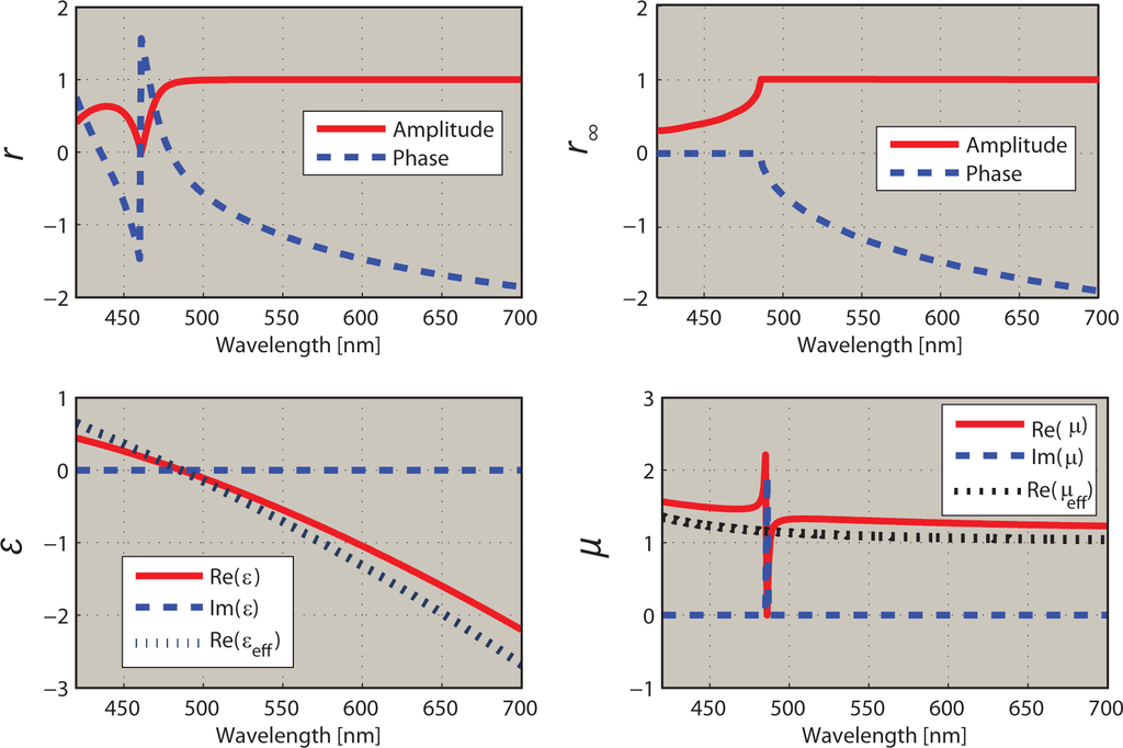 Therefore, at first glance, there should always be an epsilon-near-zero, mu-near-pole response for the case of total reflection. Figure 1 shows an example of such a situation, where we observe a spurious permeability resonance. We also see a poor match between the correct effective parameters εeff, μeff and extracted ε.