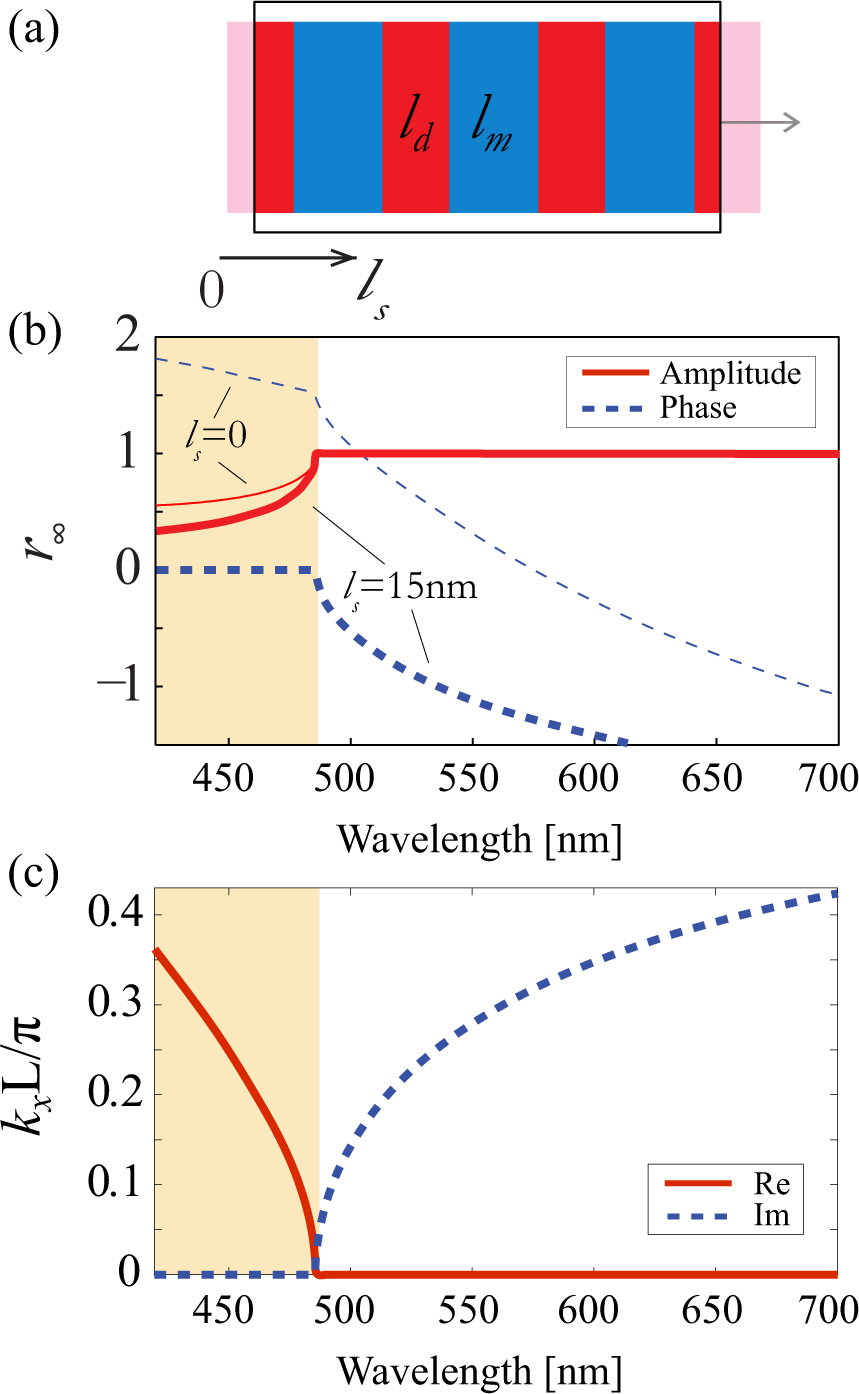 We note that since |r|2 + |t|2 = 1 in the case of total reflection, there is no transmission through the structure, regardless of whether the structure is infinite or finite. Consequently, we will obtain false material parameters for a finite structure at this point, as can be seen from Figure 1.