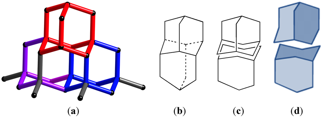 (a) Fragment of the diamond net (dia). Different tiles marked in red, purple and blue. (b) Framework of two tiles; (c) Framework of two tiles separated; (d) Two tiles separated. This net has only one type of vertex (p), one type of edge (q) one type of face (r) and one type of tile (s), so it has the transitivity 1111.