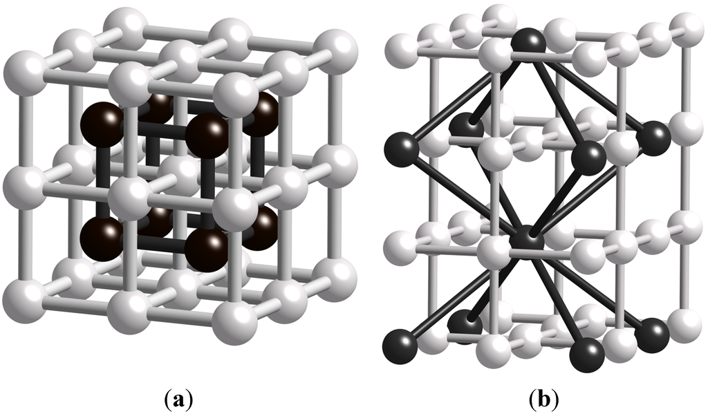 (a) The pcu net transitivity 1111 with its dual net that is an identical pcu net (self-dual); (b) The nbo net in white, transitivity 1111, with its dual the bcu net, also with transitivity 1111. Thus an identical net can easily interpenetrate the pcu net, while this possibility is not obvious for nbo or bcu.