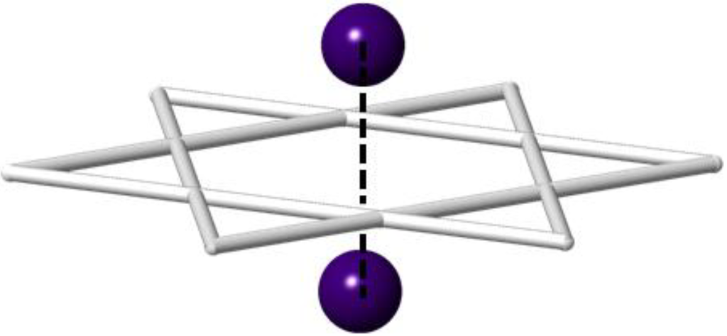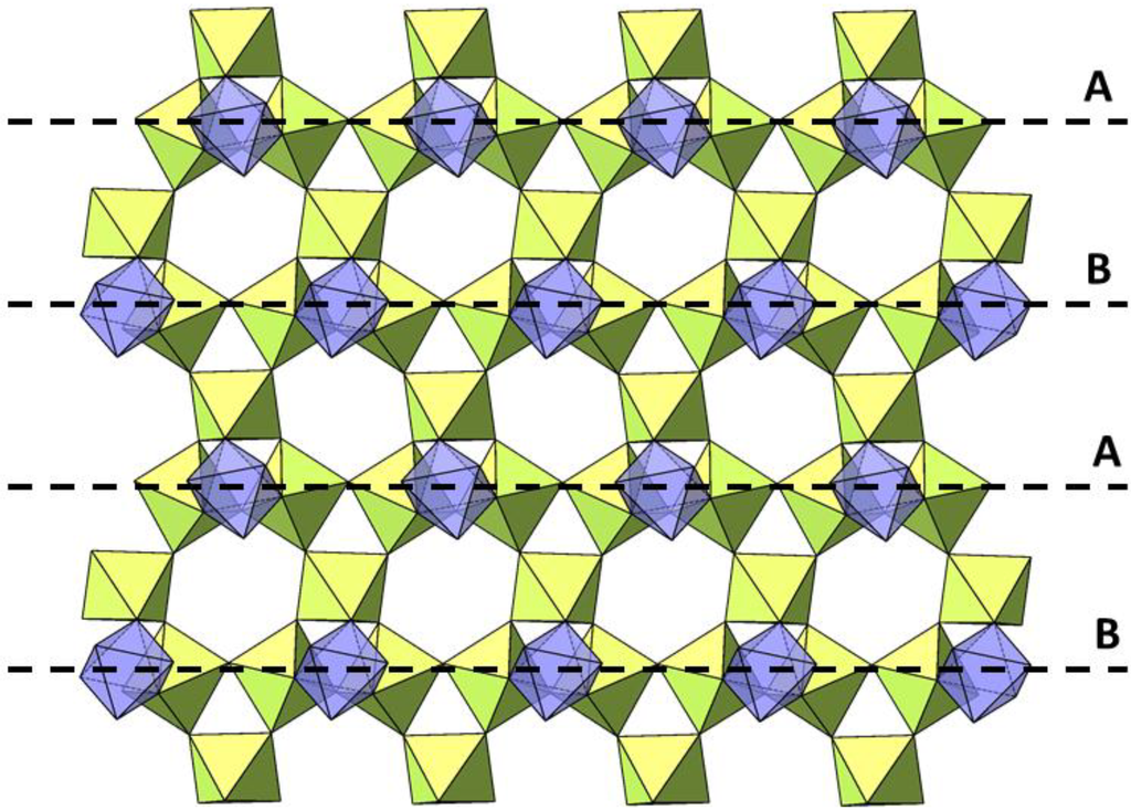 The largest reported B′ cation is Ce4+ []. At room temperature, there is a major “corrugation” distortion of the kagome layer, caused by the coordination requirements of the larger Ce4+, which in this case is eight-coordinated. This inherent distortion leads to a complex ferromagnetically-ordered structure that is far removed from the highly frustrated ground state of interest.