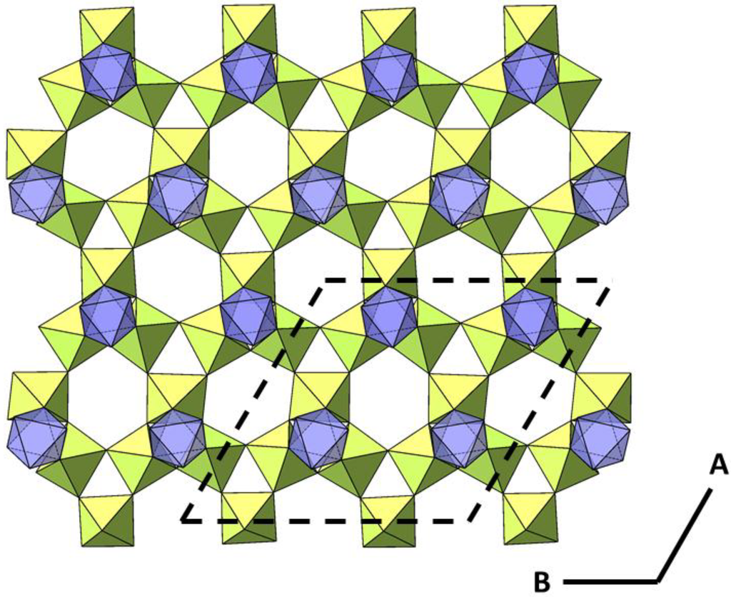 Magnetic materials adopting crystal structures based on the kagome lattice are of interest as model systems for the study of geometric magnetic frustration [,]. Particular interest has been focused on kagome lattice compounds containing S = ½ ions [,,,]—for example, Cu2+ and V4+—since quantum fluctuations can often compete with the tendency towards long-range magnetic order, leading to unusual magnetic ground states such as quantum spin-liquids (QSLs) or valence-bond solids (VBS). A family of mixed metal fluorides of general composition A2B′B3F12 (B = Cu2+, B′ = a tetravalent cation) [] has recently received attention due to the observation of an exotic VBS ground state in Rb2SnCu3F12 []. The first members of this family to be reported were Cs2ZrCu3F12 and Cs2HfCu3F12, which were found to be structurally analogous to the aristotype Cs2NaAl3F12 at room temperature []. This structure type may be considered as a derivative of the pyrochlore structure, with 1:3 ordering of cations on the B-site leading to a layered structure with kagome layers of composition [B3F12] isolated from each other by the tetravalent cations. The aristotype structure has rhombohedral symmetry, space group Rm, and exhibits a structurally “perfect” kagome lattice of co-planar, corner-shared equilateral triangles (Figure 1).