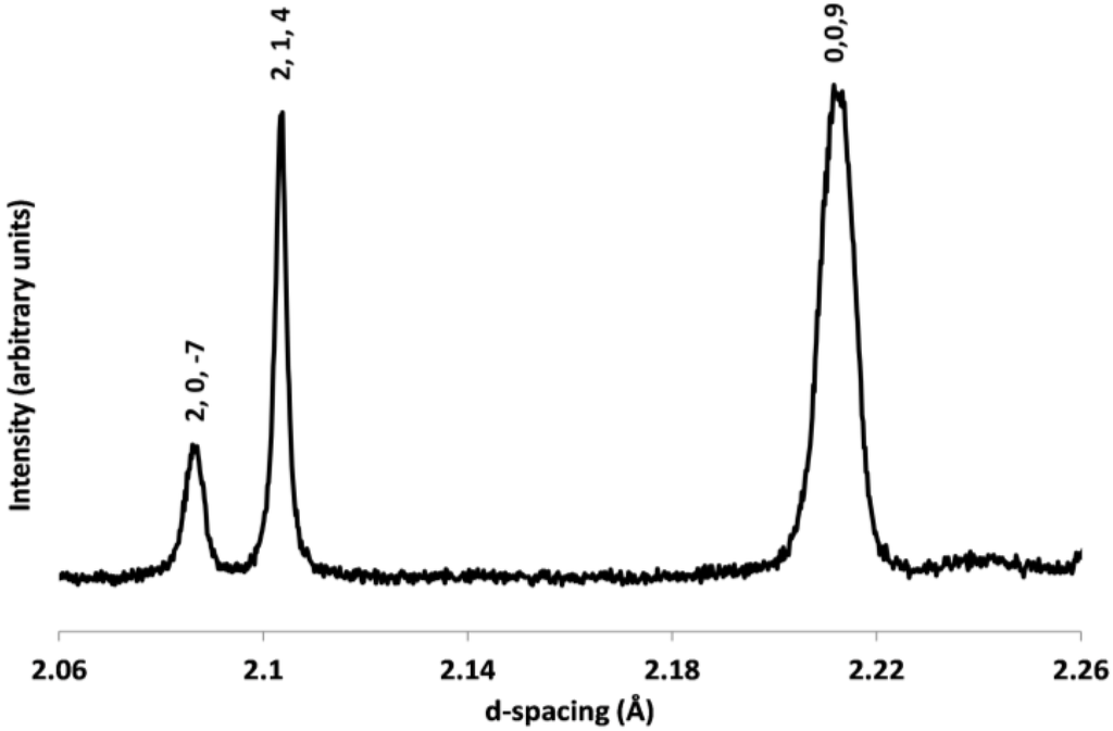 A selection of SXPD reflections for Cs2TiCu3F12 at 300 K. Note the broadening of the (0,0,9) reflection compared to (2,1,4), indicative of an anisotropy in crystallite shape.
