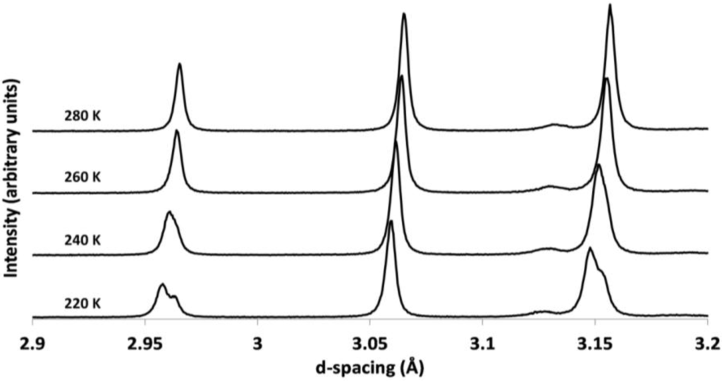 SXPD patterns for Cs2TiCu3F12 at a range of temperatures; note peak splittings appearing below 260 K.