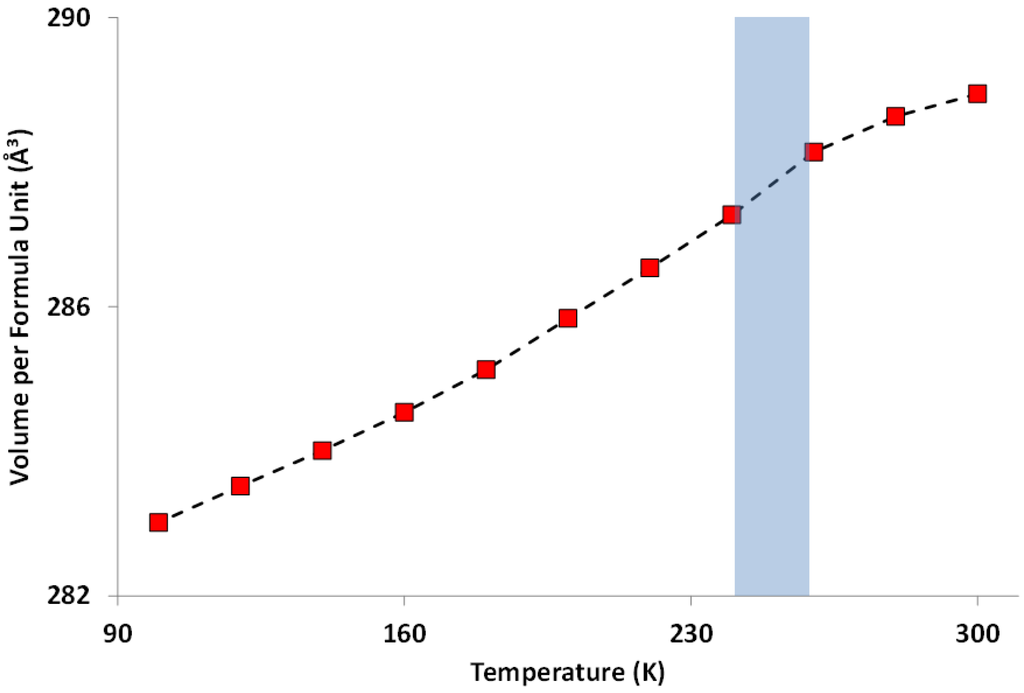 Unit cell volume per formula unit vs. temperature for Cs2TiCu3F12 powder as derived from SXPD data. Note the change in gradient indicated by the shaded area.