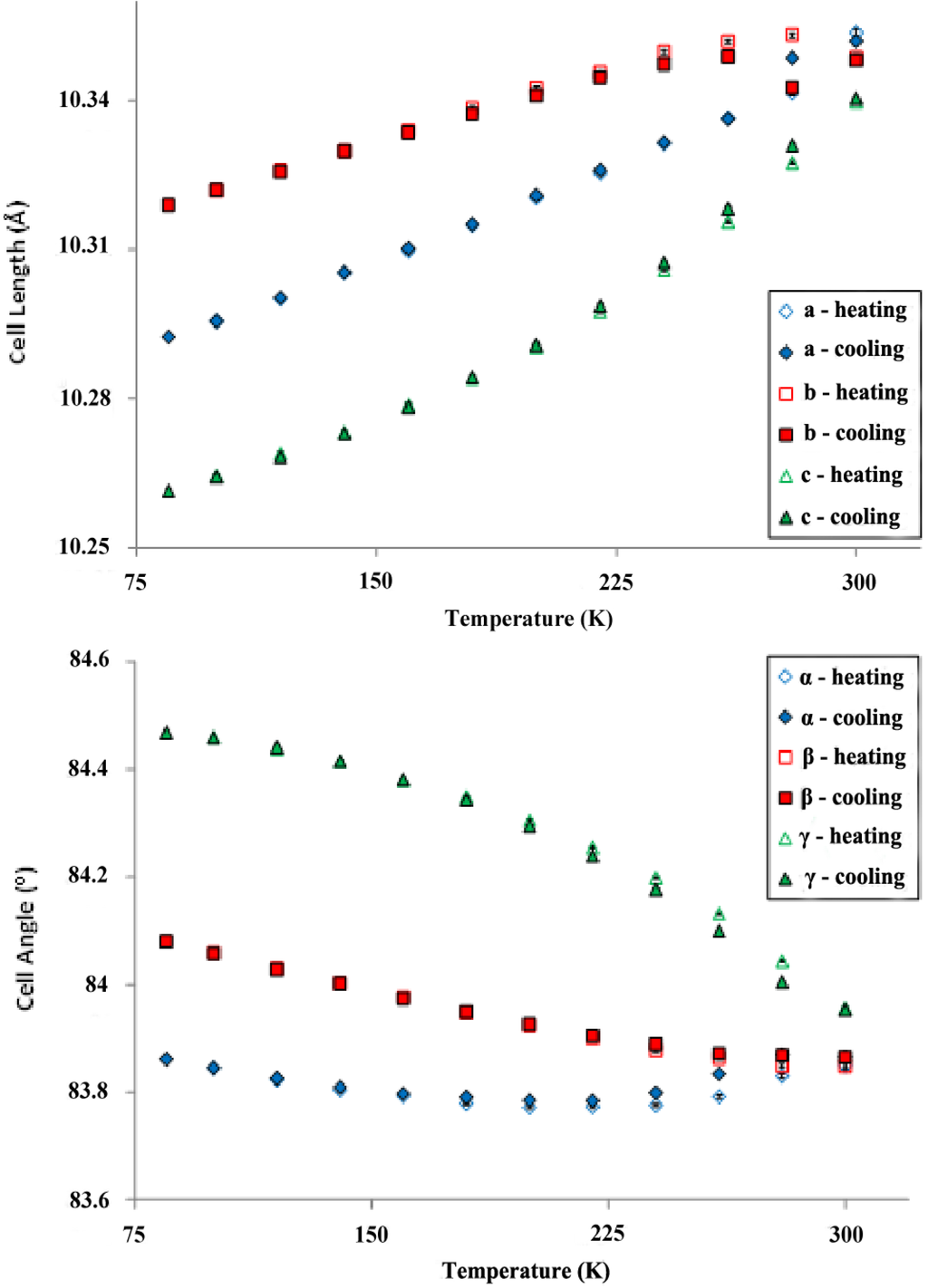 Another feature notable in the data is a hysteresis between ~150 and 300 K; the lattice parameters on heating and cooling cycles are not superimposable, as they are at lower temperatures. This indicates that the phase transition may be first order. It should be noted that there is no observable hysteresis in the unit cell volume parameter, however.