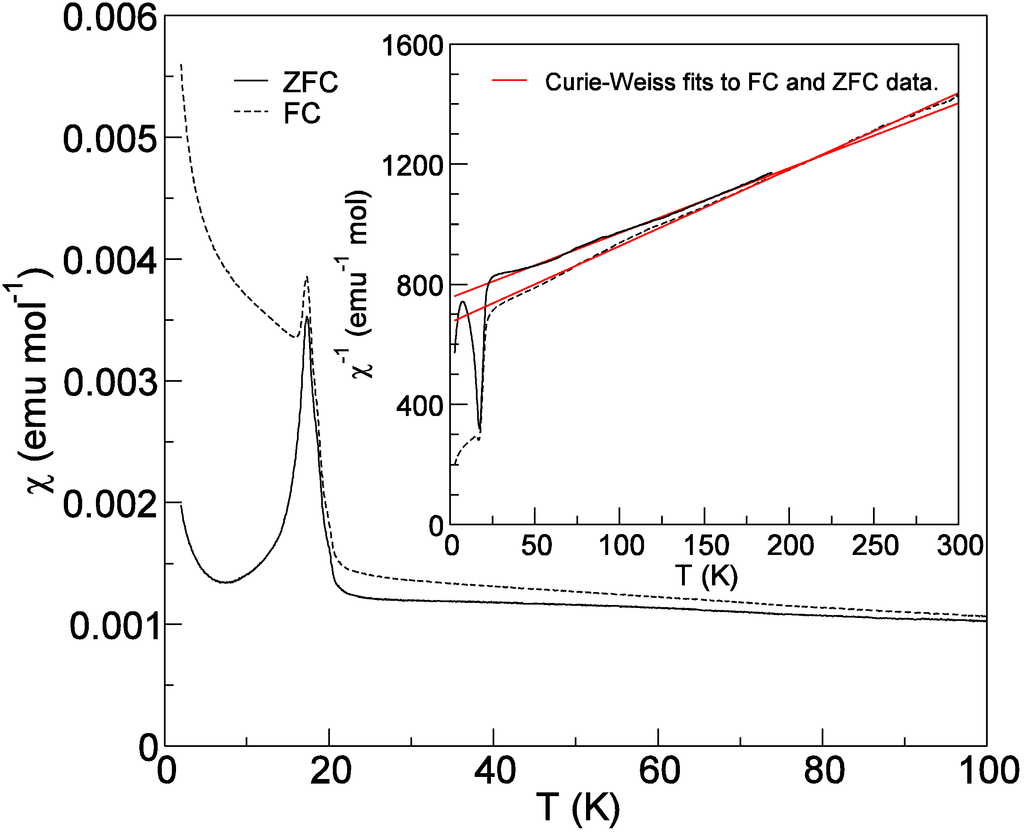 The zero-field cooled (ZFC) and field-cooled (FC) magnetic susceptibility data for a powder sample of Cs2TiCu3F12. The inset shows the inverse susceptibility with Curie-Weiss fits (red) to the linear sections of the data.