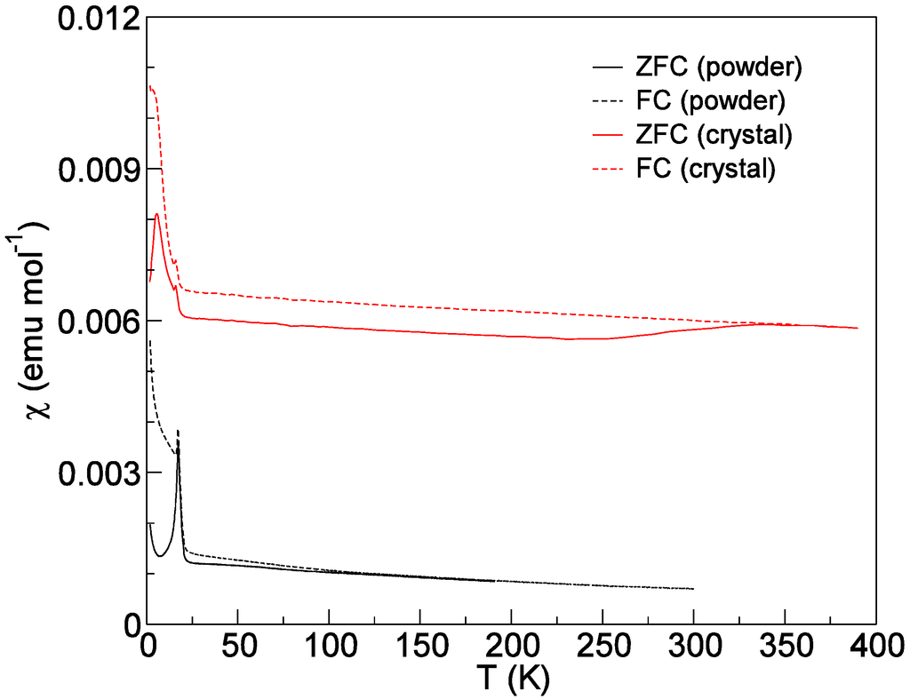 The variation of structural properties with particle size in these samples, as discussed above, is also reflected in the magnetic properties. ZFC and FC magnetic susceptibility data were measured in a magnetic field of 2 kOe, on a collection of unground single crystals (0.003 g, 0.0123 mM Cu2+). These data are clearly different from those of the powder sample; there is a divergence between the ZFC and FC susceptibility below 340 K, but also what at first sight appears to be a large temperature independent paramagnetic contribution (TIP) (Figure 10). These data show two low temperature anomalies; one at 16 K and one at 4.8 K. The higher temperature anomaly is slightly lower in temperature, and much smaller in magnitude, than that found for the powder. Attempts to model the data with a combination of TIP and a single Curie-Weiss contribution, i.e., with the equation: