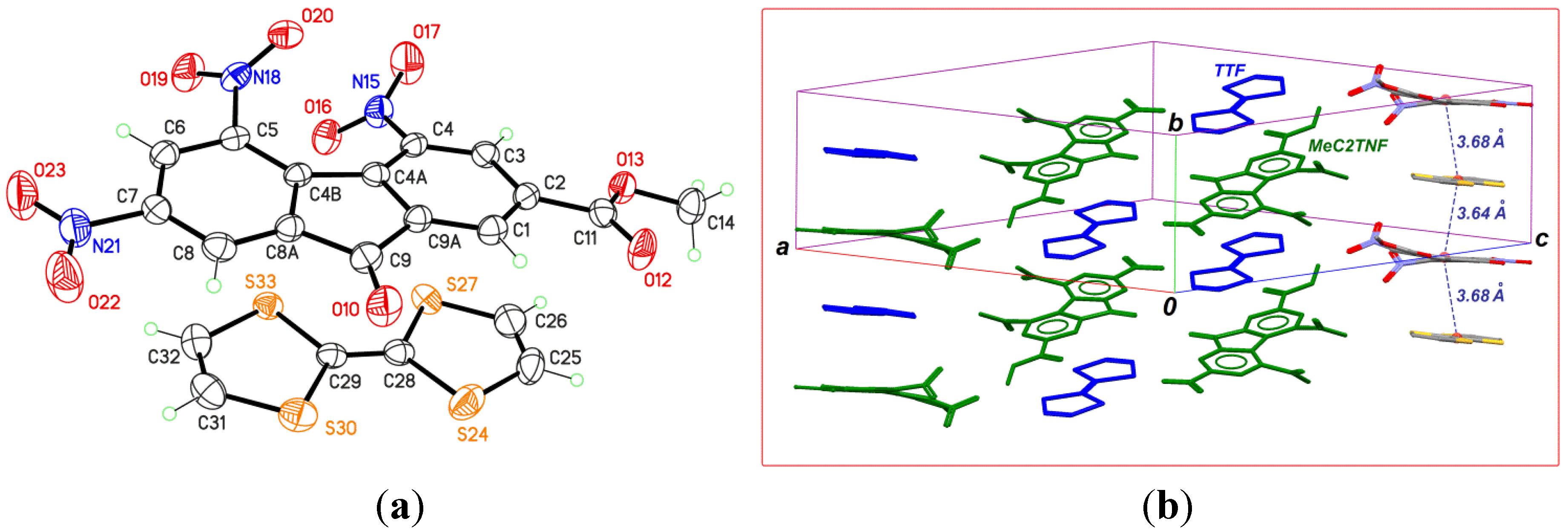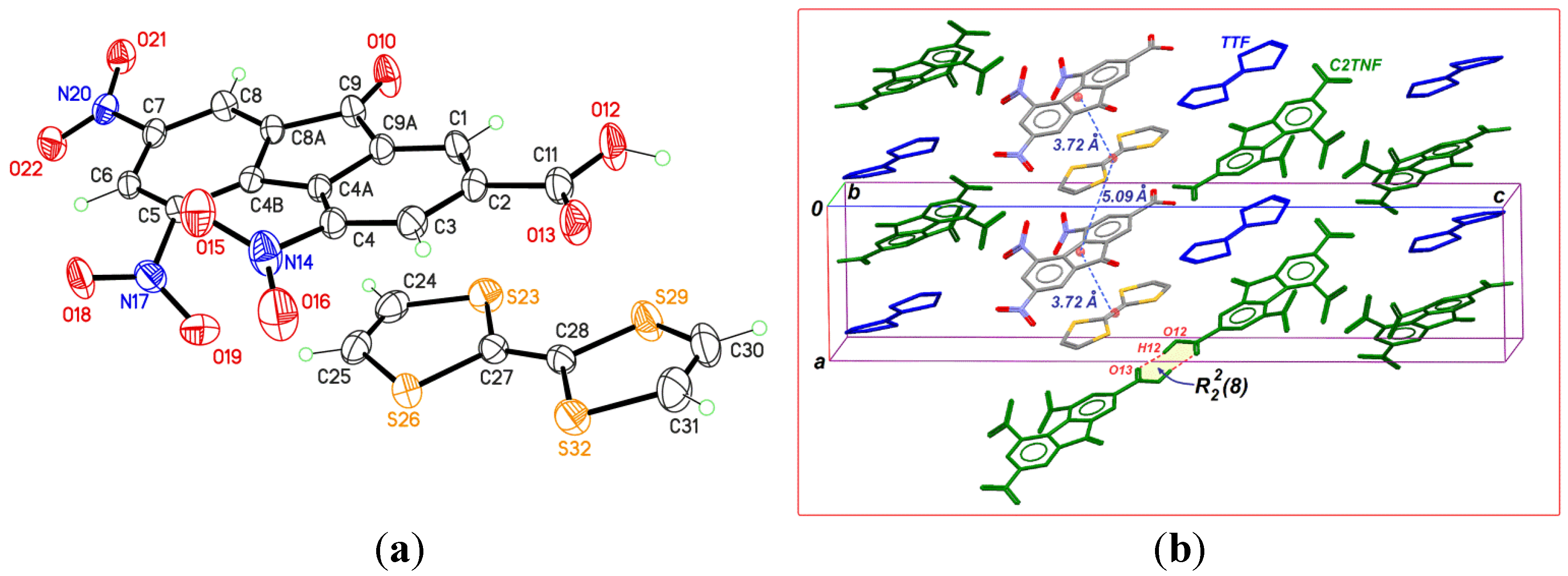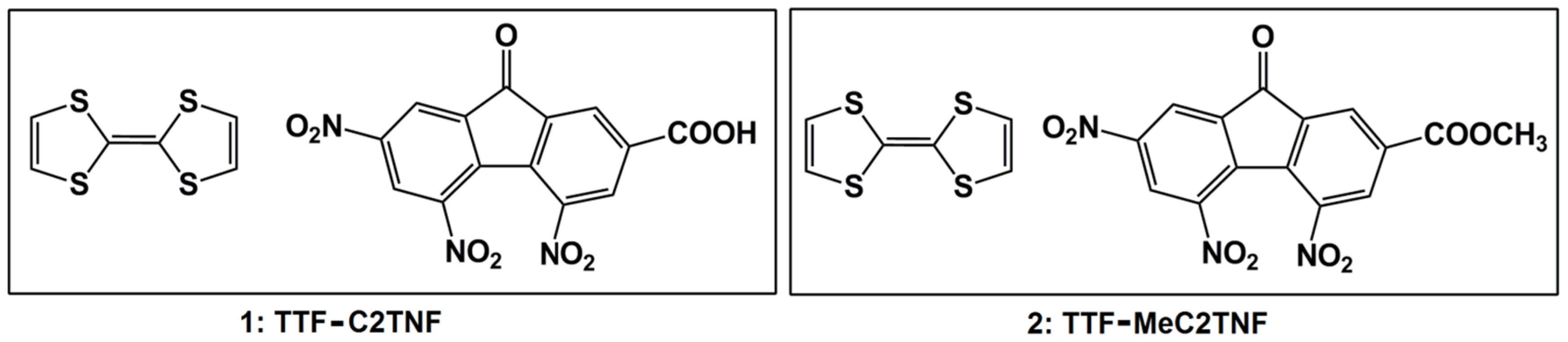 - Salmerón-Valverde, A.; Bernès, S.; Robles-Martínez, J.G. Structure and degree of charge transfer of two polymorphs of a 1:1 molecular complex: [2,2′-bis-1,3-dithiole][9-dicyanomethylene-4,5,7-trinitrofluorene-2-carboxylic acid methyl ester] (TTF-MeDC2TNF). Acta Crystallogr. 2003, B59, 505–511. [Google Scholar] [CrossRef]