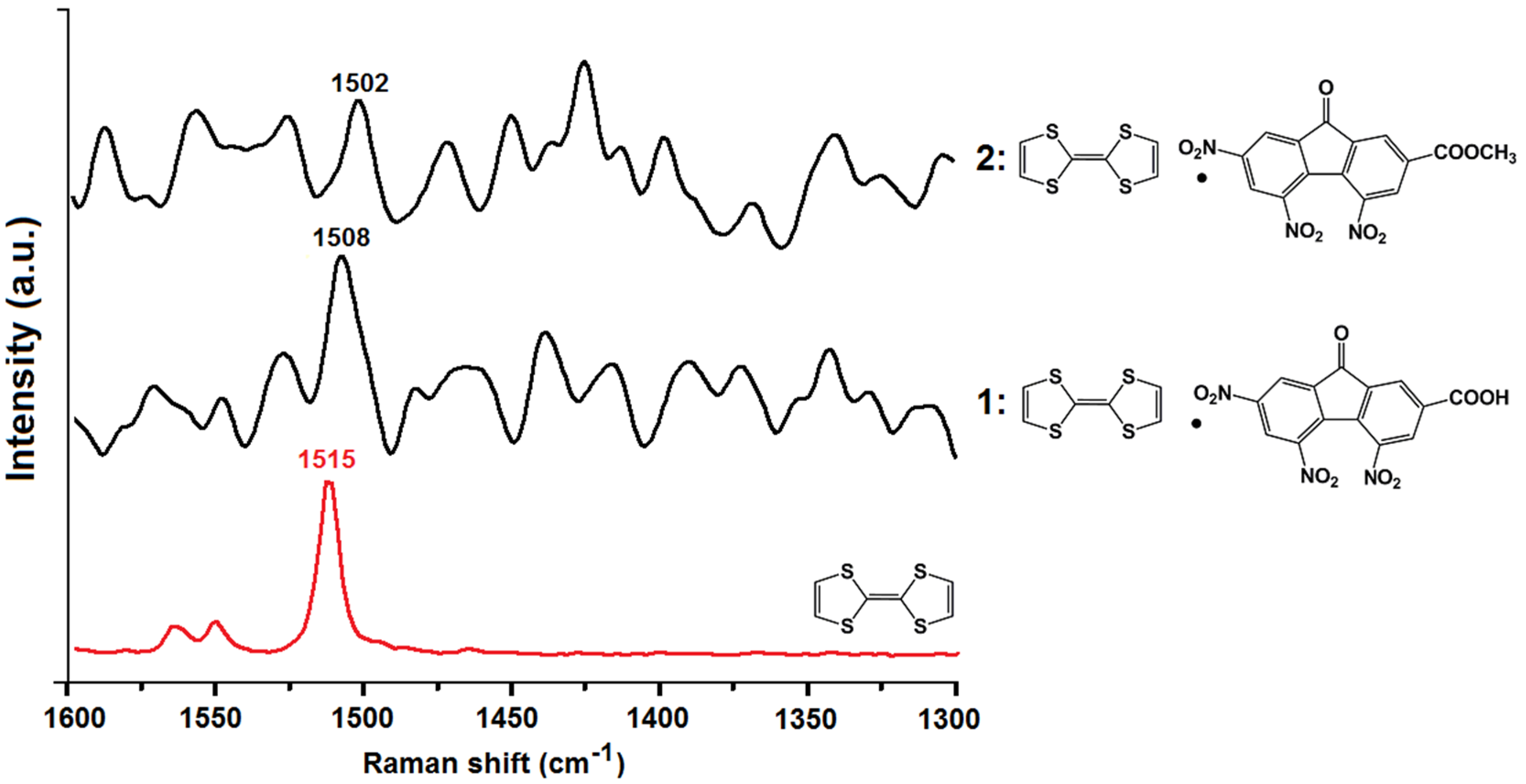 The estimation of δ in the solid state was eventually obtained using Raman spectra. The most useful vibration with that spectroscopy is the Raman-active symmetric (Ag) stretching mode for the central C=C double bond in TTF, known as v3 [18,19], which is δ-sensitive, intense, and not overlapped by active vibrations of acceptors C2TNF and MeC2TNF. This mode gives a Raman shift at 1515 cm−1 for neutral TTF, while for complexes 1 and 2, the band is displaced at 1508 and 1502 cm−1, respectively (Figure 4). On the other hand, this band shifts to 1416 cm−1 in the ionic complex (TTF)2FeCl4 in which TTF is assumed to be fully oxidized to TTF+ [20]. Using these data, the Chappell’s formula given in introduction allows us to calculate δ1 and δ2 for complexes 1 and 2: