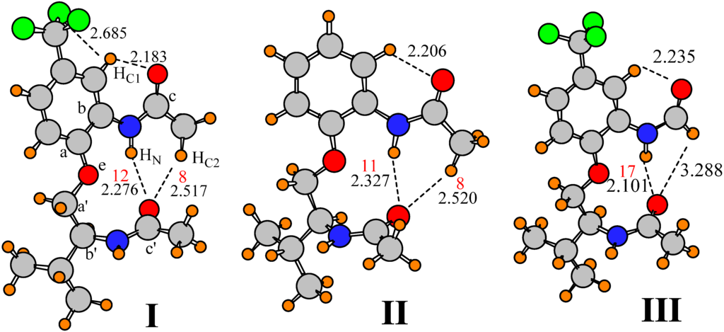 It is reasonable to presume that the isopropyl group of I has little effect upon the preferred orientations of the two amide groups, or the energetics of twisting them. When the isopropyl group was replaced by H, in addition to the removal of the CF3 group, the geometrical parameters reported for IV in Table 2 and Table 4 (see Figure 2) indicate only minor changes. There are short elongations of three H-bonds, accompanied by small reductions in E(2) and ρBCP, but the orientations of the two amides remain unchanged. With regard to energetics of distortion, there are only small differences caused by removal of the isopropyl group, on the order of 0.3 kcal/mol, which confirms the small changes of the structure, and the lack of influence of the isopropyl group.