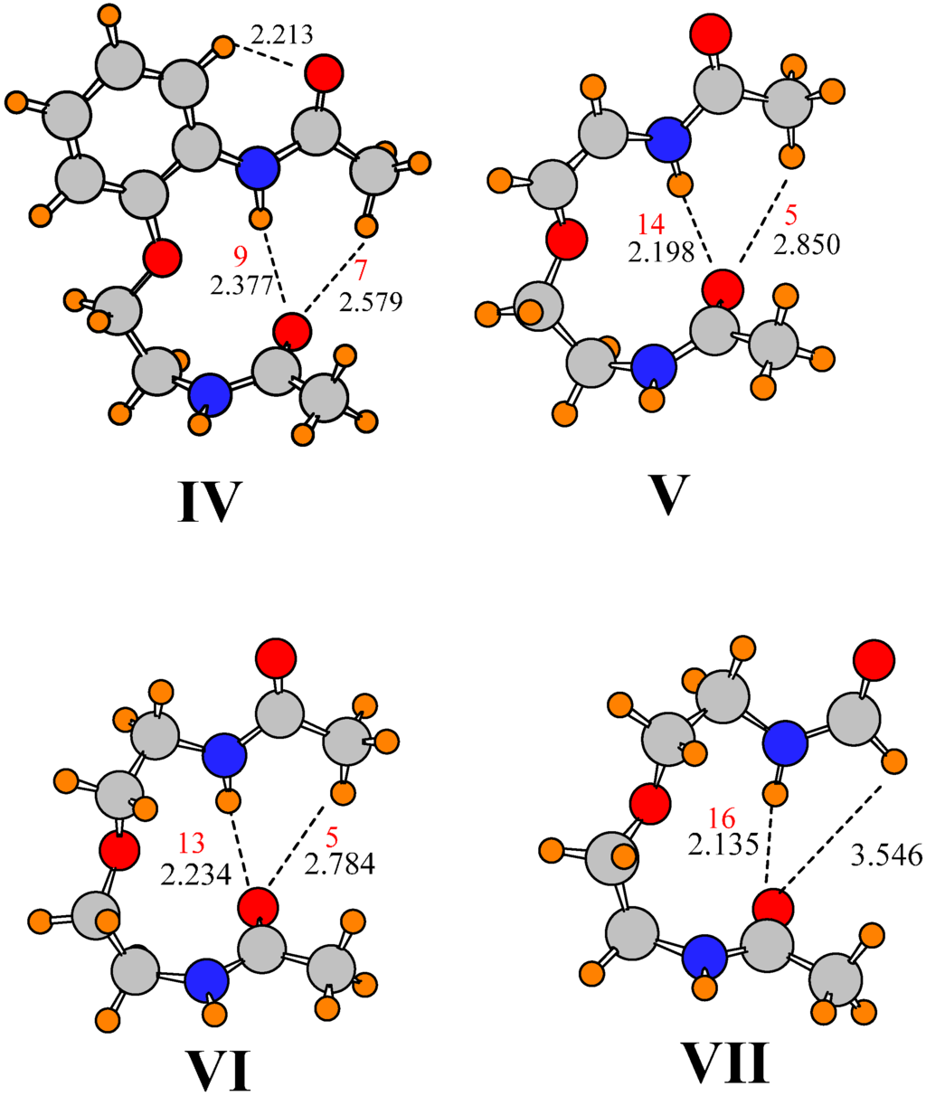 Natural bond orbital (NBO) values of E(2) (kcal/mol) for potential H-bonds in structures I-VII.