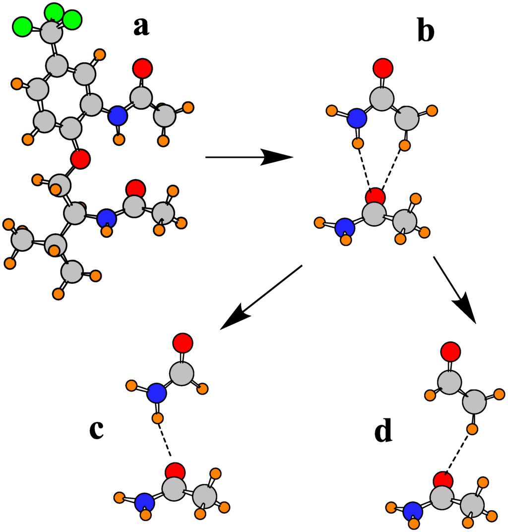 Scheme for partitioning total interaction energy between pair of amides into separate contributions from NH∙∙∙O and CH∙∙∙O.