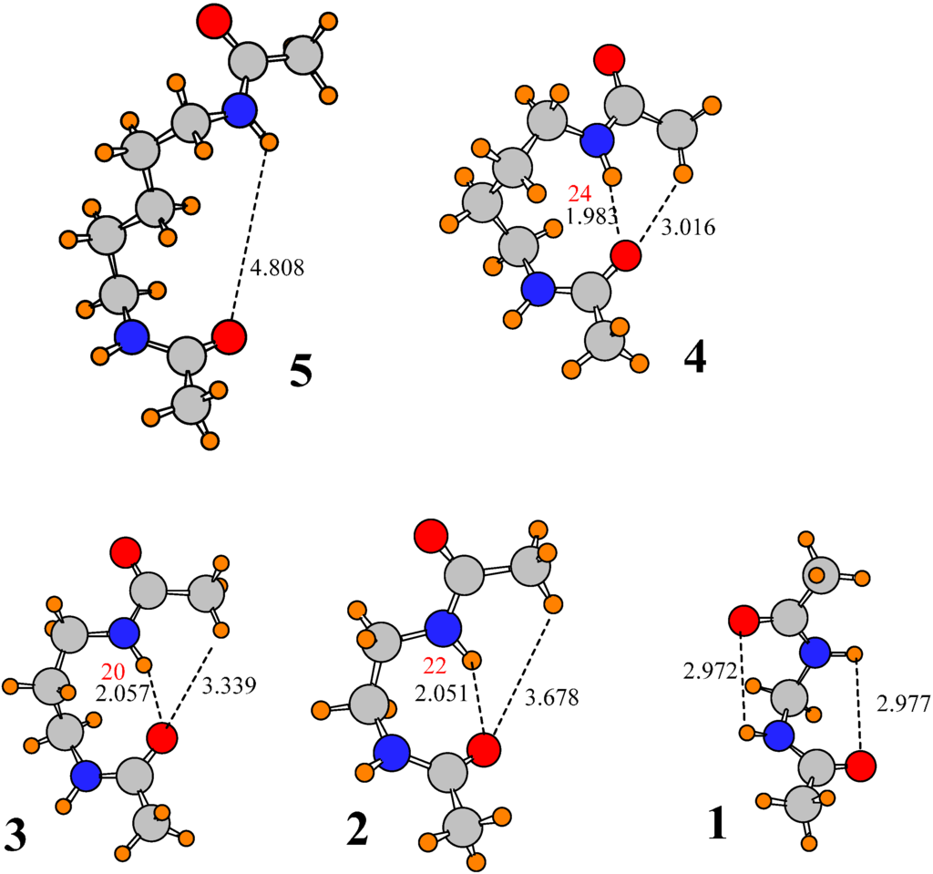 The first candidate was one in which both the upper and lower amide groups were rotated by roughly 180°, around the Cb–N and Cb’–N bonds, respectively. The structure contains a NH∙∙O H-bond between the two amides, but this H-bond involves a C=O from the upper amide, and N–H from the lower, opposite to that in I above. Geometry optimization yielded a minimum which retains this H-bond, but this structure was 4.8 kcal/mol higher in energy than conformation I. A second possible starting point orients the two amide groups parallel to one another in a stacked arrangement, with no interamide H-bond, a structure which prior calculations have indicated might represent a minimum [100]. The minimum obtained for this structure was 6.0 kcal/mol higher in energy than I. Also explored was the possibility of a reorientation within the backbone. A ~120° rotation around the Ca’–Cb’ bond removes the two amide groups from the vicinity of one another, eliminating any interamide H-bonds. The optimized structure was found to be 2.1 kcal/mol higher than I. Likewise for a rotation around the Oe–Ca’ bond: a 120° rotation, followed by optimization, leads to a higher energy, in this case by 5.3 kcal/mol.