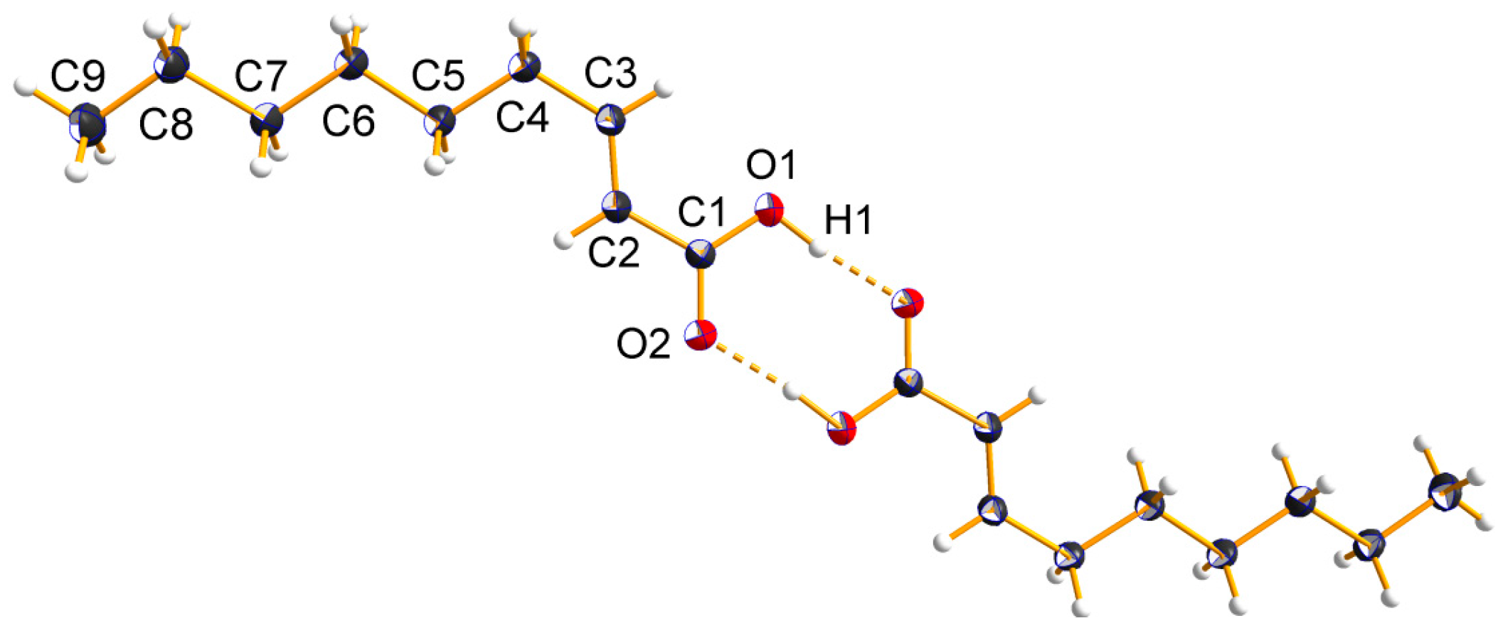 Crystal structure determinations of α,β-unsaturated carboxylic acids are still scarce in the literature. The crystal structures of acrylic acid (C3) [9,10,11,12], and crotonic acid (C4) [13] have been known for more than 40 years, while recently the crystal structures of four more members of α,β-unsaturated carboxylic acids, (E)-pent-2-enoic acid (C5) [14], (E)-hex-2-enoic acid (C6) [15], (E)-undec-2-enoic acid (C11) [16], and (E)-dodec-2-enoic acid (C12) [17], respectively, have been reported. In addition, two crystal structure determinations of co-crystals containing C6 are also known [18,19]. In comparison a complete set of crystal structures of the corresponding saturated carboxylic acids (propionic acid to pentadecanoic acid) is available from the literature [20,21,22,23,24]. In this contribution, we report on the synthesis, characterization and crystal structure determinations of two members of the series of α,β-unsaturated carboxylic acids: (E)-non-2-enoic acid (C9) and (E)-dec-2-enoic acid (C10), respectively, which are linked into centrosymmetric dimers via pairs of O–H∙∙∙O hydrogen bonds in the crystals.