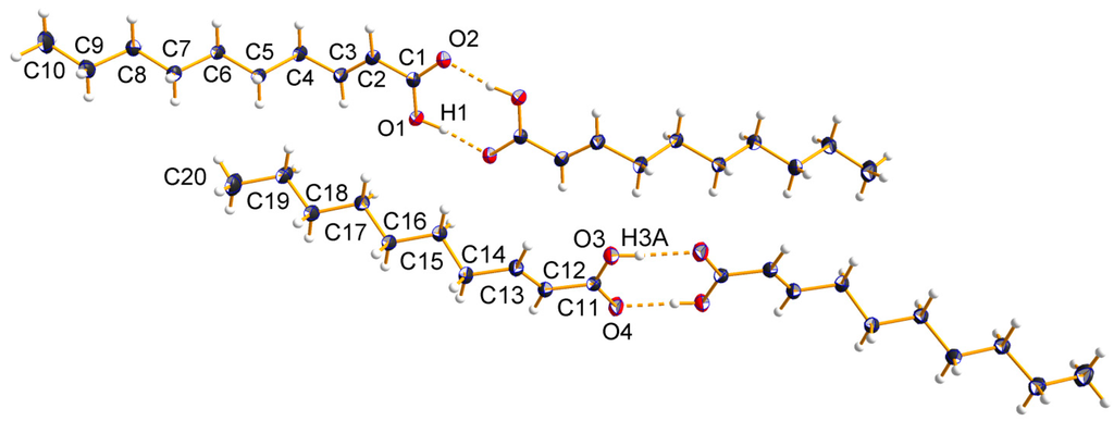 Molecular structures of linked acid dimers of the title compounds with pairs of O–H∙∙∙O hydrogen bonds are shown in Figure 1 and Figure 2, respectively, with atom-labeling scheme and displacement thermal ellipsoids at the 50% probability level. Crystal and instrumental parameters of the crystal structure determinations of C9 and C10 can be found in Table 1.