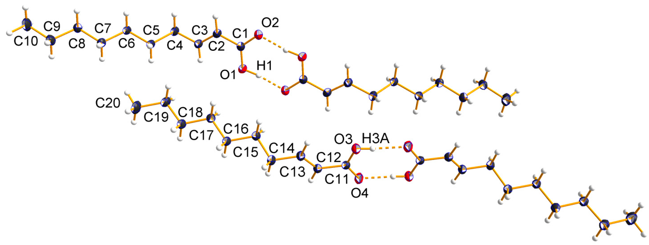 - Bond, A.D. On the crystal structures and melting point alternation of the n-alkyl carboxylic acids. New J. Chem. 2004, 28, 104–114. [Google Scholar] [CrossRef]