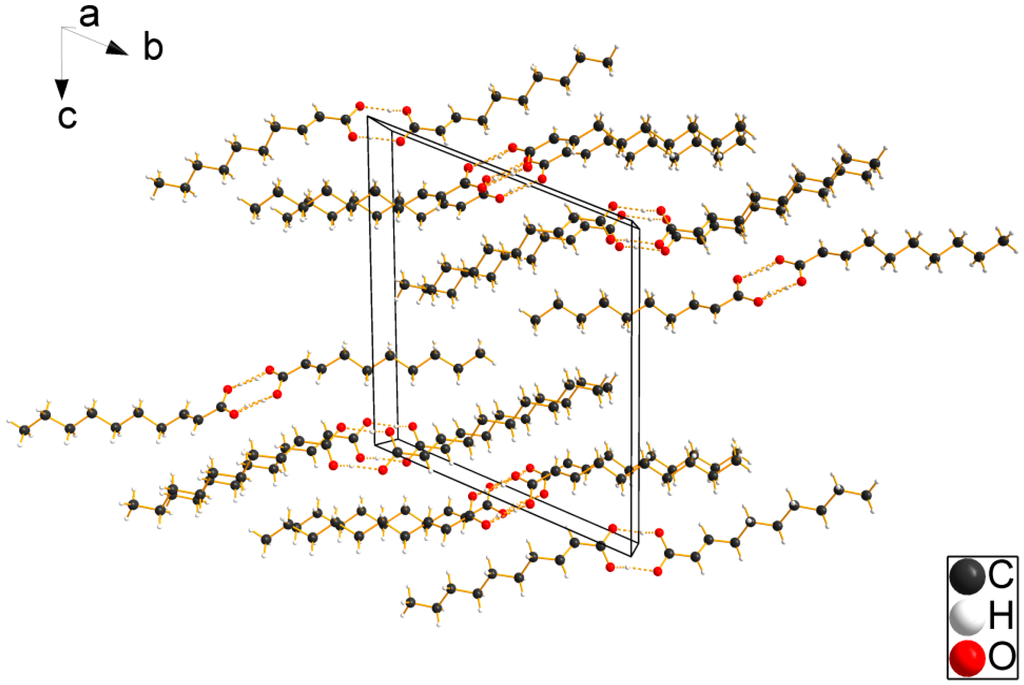 Interestingly, all corresponding saturated carboxylic acids crystallize exclusively in monoclinic space groups at low temperatures, either in C2/m (No. 12) [], P21/c (No. 14) [,,], or C2/c (No. 15) [], respectively, whereas only the high-pressure form of propionic acid crystallizes in the triclinic space group P-1 (No. 2) []. In contrast to this findings, the analogous α,β-unsaturated carboxylic acids crystallize either in orthorhombic (C3: Ibam) [,,,], monoclinic (C4: C2/c) [], or triclinic (C5, C6, C11, C12: P-1) [,,,] space groups. The high-pressure form of acrylic acid crystallizes in the monoclinic space group P21/c (No. 14) []. Bond lengths and angles in C9 and C10 resemble closely values found in other α,β-unsaturated carboxylic acids [,,,,,,,,,,]. The crystal structures of C9 and C10 are characterized by carboxylic acid inversion dimers linked by pairs of O–H∙∙∙O hydrogen bonds. Views of the packing of acid dimer layers in C9 and C10 are depicted in Figure 3 and Figure 4, respectively. All non-hydrogen atoms of C9 lie almost in one plane with a torsion angle between the carboxylic group and the alkyl chain of 8.1° (C2–C3–C4–C5). In contrast, C10 features two symmetry-independent molecules, which adopt a conformation where the carboxylic group and the following three carbon atoms of the chain of the molecules lie almost in one plane and the remaining carbon atoms of the hydrocarbon chain adopt a nearly fully staggered conformation with torsion angles C2–C3–C4–C5: 127.7° and C12–C13–C14–C15: 122.8°, respectively.