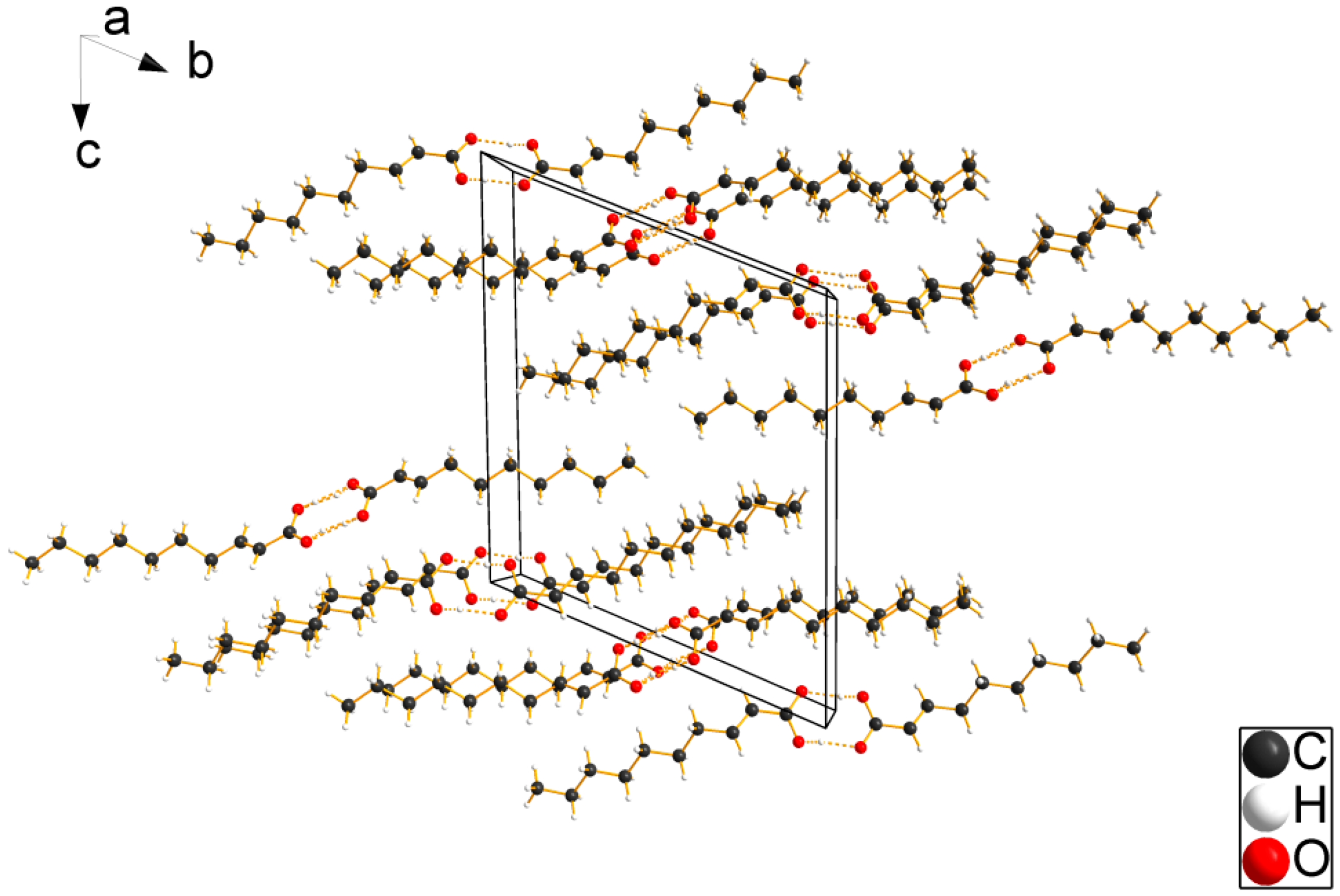 Interestingly, all corresponding saturated carboxylic acids crystallize exclusively in monoclinic space groups at low temperatures, either in C2/m (No. 12) [22], P21/c (No. 14) [20,23,24], or C2/c (No. 15) [24], respectively, whereas only the high-pressure form of propionic acid crystallizes in the triclinic space group P-1 (No. 2) [21]. In contrast to this findings, the analogous α,β-unsaturated carboxylic acids crystallize either in orthorhombic (C3: Ibam) [9,10,11,12], monoclinic (C4: C2/c) [13], or triclinic (C5, C6, C11, C12: P-1) [14,15,16,17] space groups. The high-pressure form of acrylic acid crystallizes in the monoclinic space group P21/c (No. 14) [12]. Bond lengths and angles in C9 and C10 resemble closely values found in other α,β-unsaturated carboxylic acids [9,10,11,12,13,14,15,16,17,18,19]. The crystal structures of C9 and C10 are characterized by carboxylic acid inversion dimers linked by pairs of O–H∙∙∙O hydrogen bonds. Views of the packing of acid dimer layers in C9 and C10 are depicted in Figure 3 and Figure 4, respectively. All non-hydrogen atoms of C9 lie almost in one plane with a torsion angle between the carboxylic group and the alkyl chain of 8.1° (C2–C3–C4–C5). In contrast, C10 features two symmetry-independent molecules, which adopt a conformation where the carboxylic group and the following three carbon atoms of the chain of the molecules lie almost in one plane and the remaining carbon atoms of the hydrocarbon chain adopt a nearly fully staggered conformation with torsion angles C2–C3–C4–C5: 127.7° and C12–C13–C14–C15: 122.8°, respectively.