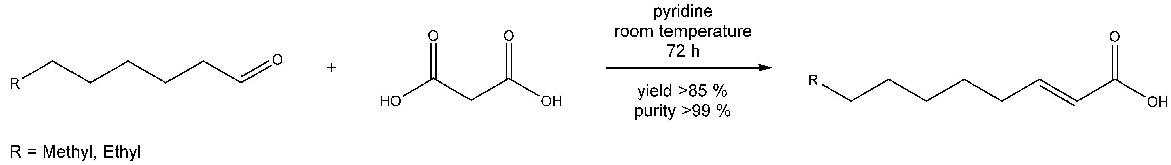 Malonic acid (25.0 g, 240.2 mmol, 1.0 eq) was dissolved in dry pyridine (38.0 g, 480.5 mmol, 2.0 eq) at room temperature in a three-necked flask equipped with a magnetic stir bar and a reflux condenser under a mild flow of argon. The appropriate aldehyde (240.2 mmol, 1.0 eq) was then added in one portion and the resulting clear solution was further stirred for 72 h at room temperature under argon. Afterwards, the resulting light yellow to orange solution was brought to an acidic pH value by adding phosphoric acid at 0 °C (42.5 wt. %, 138.5 g, 600.6 mmol, 2.5 eq). The resulting two layers were extracted three times with 150 mL portions of ethyl acetate and reduced to a volume of ca. 150 mL in vacuo. To remove impurities from aldol condensation the raw acid was converted into the corresponding sodium salt by addition of an aqueous solution of sodium carbonate (20.4 g, 192.2 mmol, 0.8 eq in 200 mL). After stirring for 30 min the water phase was separated and extracted three times with 150 mL portions of ethyl acetate. The water phase was then acidified with concentrated hydrochloric acid (37.0 wt. %, 35.5 g, 360.4 mmol, 1.5 eq), the organic phase was separated and the water phase was again extracted three times with 150 mL portions of ethyl acetate. The combined organic phases were dried over Na2SO4 and evaporated to dryness in vacuo. The resulting raw product was further purified by distillation in vacuo yielding the product in purity > 99% (GC).
